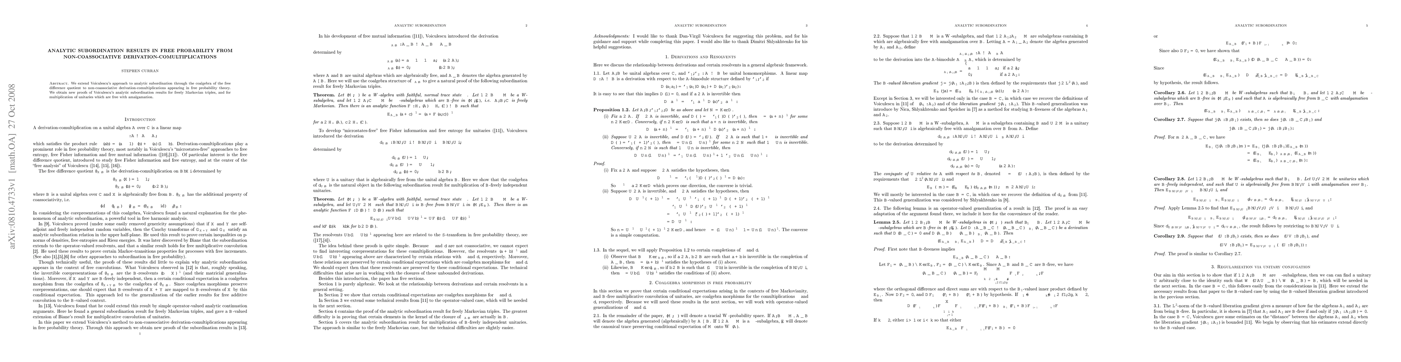 We extend Voiculescu's approach to analytic subordination through the coalgebra of the free difference quotient to non-coassociative derivation-comultiplications appearing in free probability theory. We obtain new proofs of Voiculescu's analytic subordination results for freely Markovian triples, and for multiplication of unitaries which are free with amalgamation.