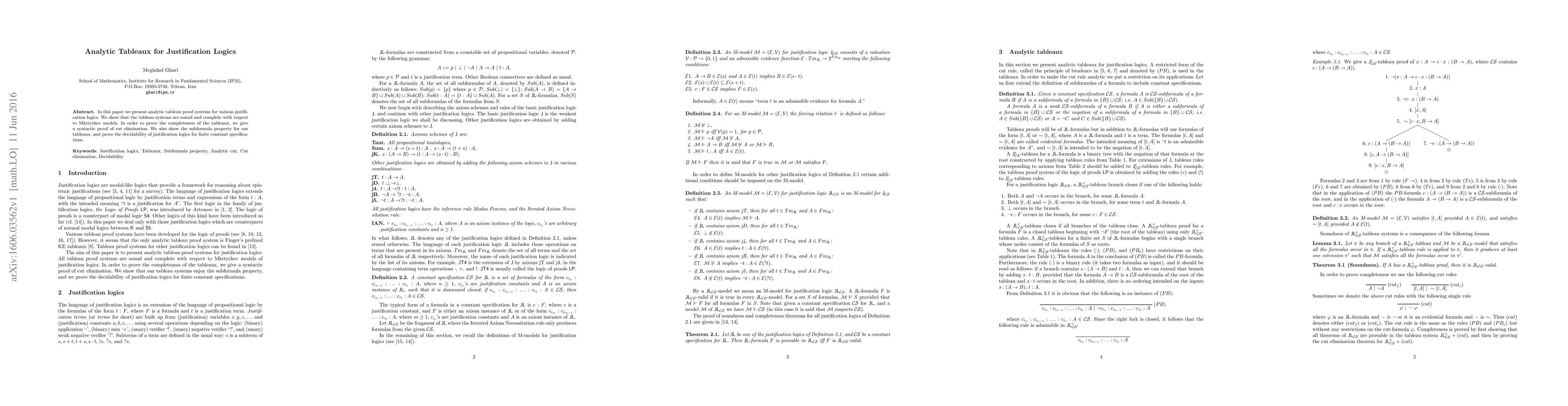 This paper introduces analytic tableau proof systems for justification logics, demonstrating their soundness, completeness with respect to Mkrtychev models, and the subformula property. It also proves the decidability of these logics under finite constant specifications.
