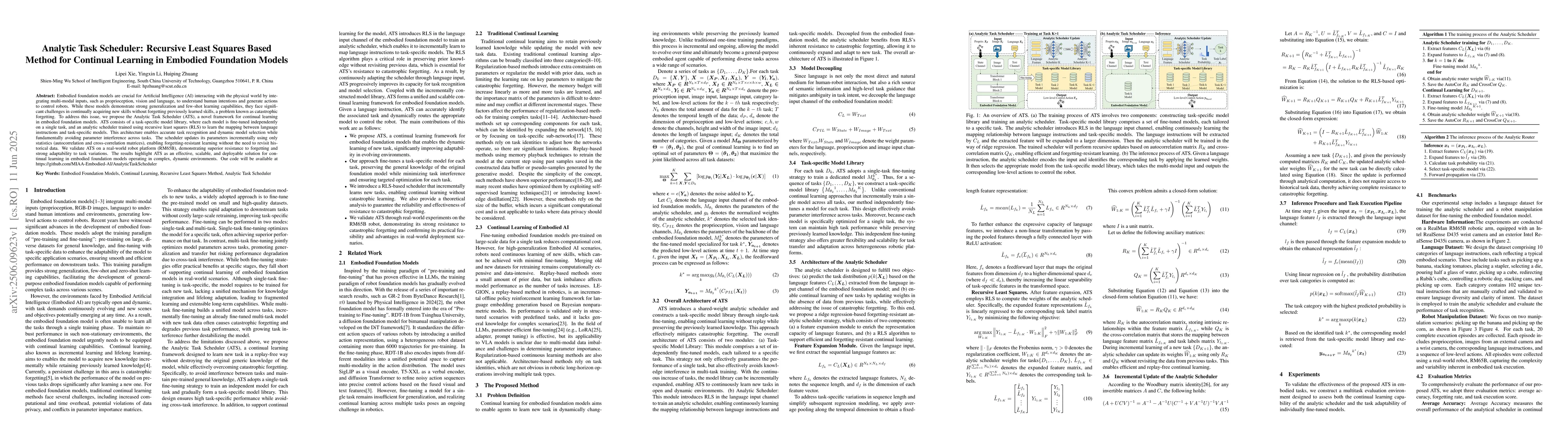 A new framework called Analytic Task Scheduler (ATS) is proposed to address catastrophic forgetting in embodied foundation models, demonstrating superior resistance to forgetting and strong adaptability to task variations.