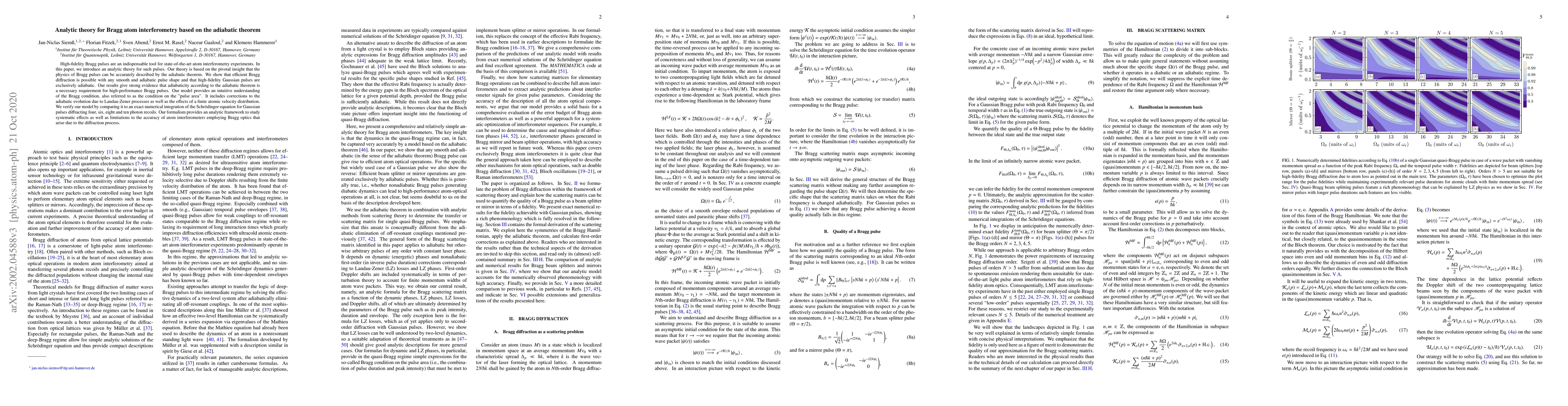 High-fidelity Bragg pulses are an indispensable tool for state-of-the-art atom interferometry experiments. In this paper, we introduce an analytic theory for such pulses. Our theory is based on the pivotal insight that the physics of Bragg pulses can be accurately described by the adiabatic theorem. We show that efficient Bragg diffraction is possible with any smooth and adiabatic pulse shape and that high-fidelity Gaussian pulses are exclusively adiabatic. Our results give strong evidence that adiabaticity according to the adiabatic theorem is a necessary requirement for high-performance Bragg pulses. Our model provides an intuitive understanding of the Bragg condition, also referred to as the condition on the "pulse area". It includes corrections to the adiabatic evolution due to Landau-Zener processes as well as the effects of a finite atomic velocity distribution. We verify our model by comparing it to an exact numerical integration of the Schr\"odinger equation for Gaussian pulses diffracting four, six, eight and ten photon recoils. Our formalism provides an analytic framework to study systematic effects as well as limitations to the accuracy of atom interferometers employing Bragg optics that arise due to the diffraction process.