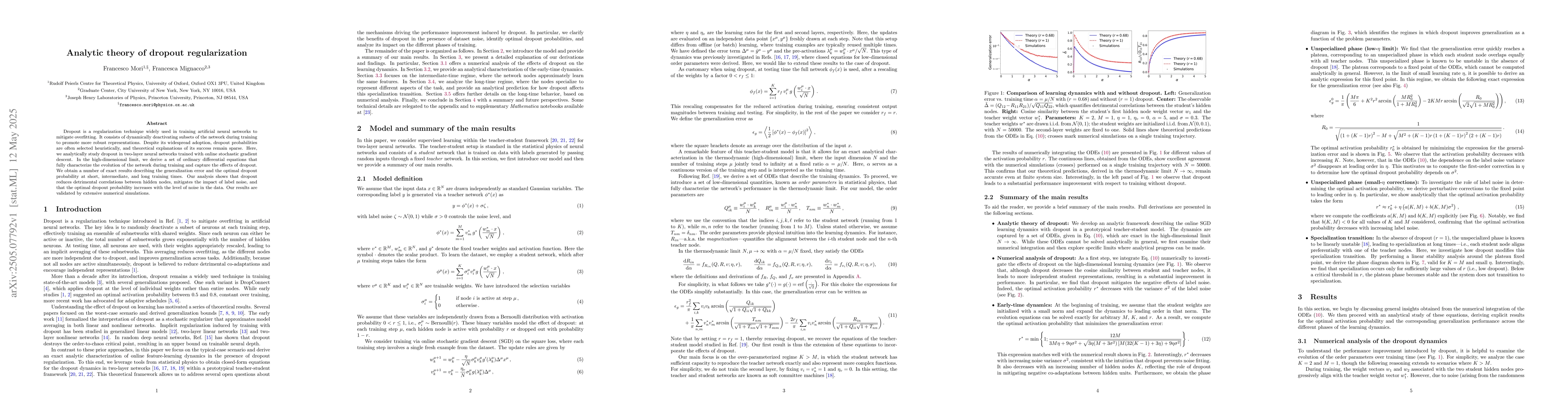 Researchers analytically study dropout regularization in neural networks, finding it reduces correlations between hidden nodes and mitigates label noise, with optimal dropout probabilities increasing with data noise.