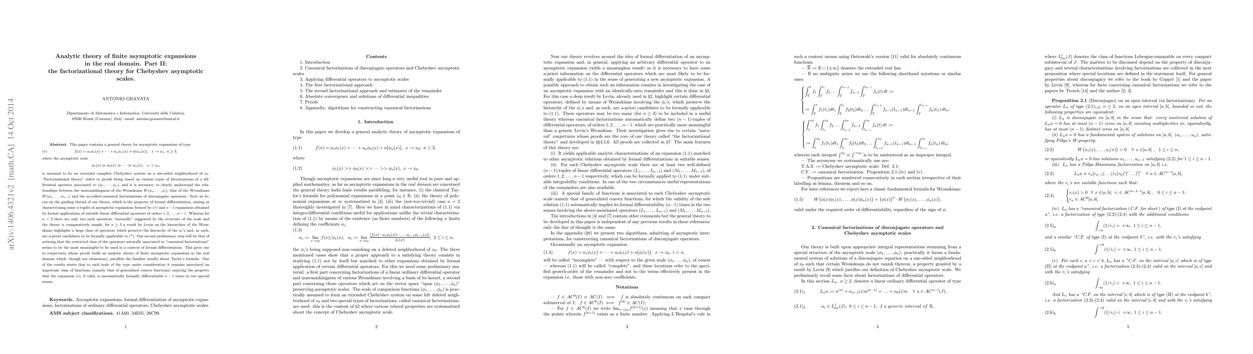 This paper contains a general theory for asymptotic expansions of type (*) f(x)=a_1 phi_1(x)+...+a_n phi_n(x)+o(phi_n(x)), x tends to x_0, n>=3, where the asymptotic scale phi_1(x)>>phi_2(x)>>...>>phi_n(x), x tends to x_0, is assumed to be an extended complete Chebyshev system on a one-sided neighborhood of x_0. "Factorizational theory" refers to proofs being based on various types of factorizations of a differential operator associated to (phi_1,...,phi_n), hence we preliminarly collect various results concerning the concept of Chebyshev asymptotic scale, associated disconjugate operators and canonical factorizations. Another guiding thread of our theory is the property of formal differentiation and we aim at characterizing some n-tuples of asymptotic expansions formed by (*) and (n-1) expansions obtained by formal applications of suitable linear differential operators of orders 1,2,...,n-1. Our second preliminary step will be that of discovering that the class of the operators naturally associated to "canonical" factorizations seems to be the most meaningful to be used in a context of formal differentiation. This gives rise to conjectures whose proofs build an analytic theory of finite asymptotic expansions in the real domain which, though not elementary, parallels the familiar results about Taylor's formula. One of the results states that to each scale of the type under consideration it remains associated an important class of functions (namely that of generalized convex functions) enjoying the property that the expansion (*), if valid, is automatically formally differentiable (n-1) times in two special senses.