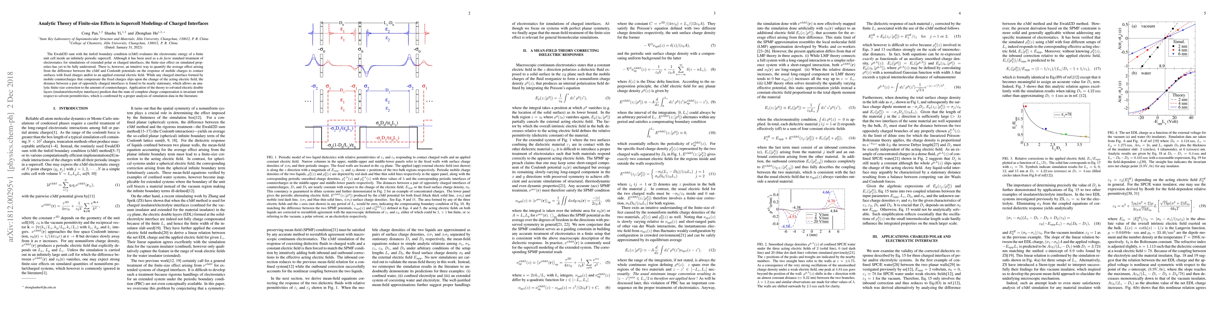 This paper develops an analytic theory to quantify finite-size effects in supercell modelings of charged interfaces using the Ewald3D sum with tinfoil boundary conditions. It reveals that the distance between oppositely charged interfaces remains nearly constant, enabling an analytic correction for finite-size effects on countercharges, and confirms the invariance of complete charge compensation in solvated electric double layers across different solvent permittivities.