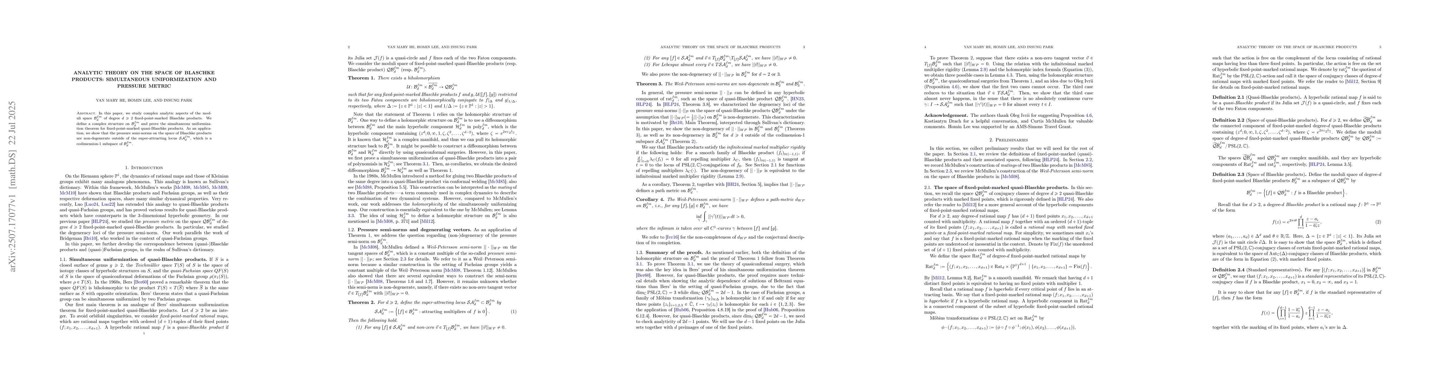 In this paper, we study complex analytic aspects of the moduli space $\Bcal_d^{fm}$ of degree $d\ge2$ fixed-point-marked Blaschke products. We define a complex structure on $\Bcal_d^{fm}$ and prove the simultaneous uniformization theorem for fixed-point-marked quasi-Blaschke products. As an application, we show that the pressure semi-norms on the space of Blaschke products are non-degenerate outside of the super-attracting locus $\mathcal{SA}^{fm}_d$, which is a codimension-1 subspace of $\Bcal^{fm}_d$.
