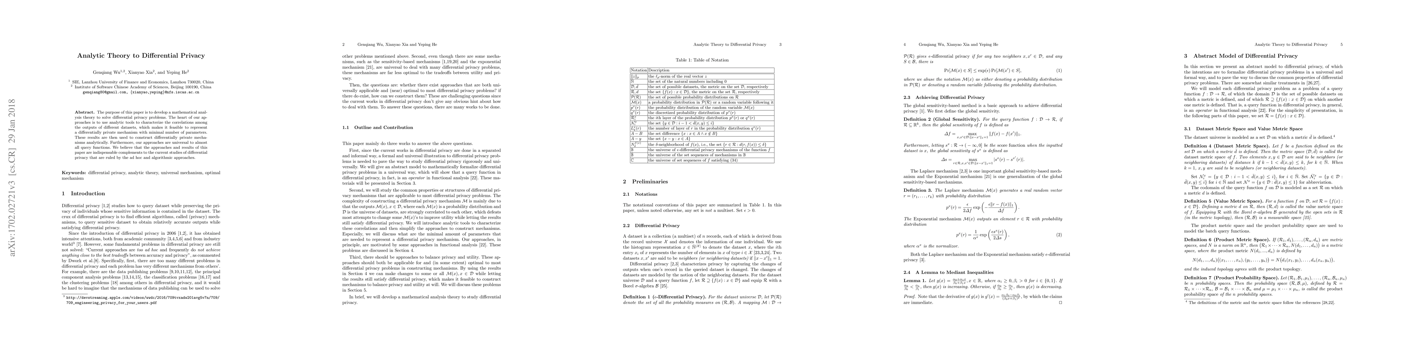 The purpose of this paper is to develop a mathematical analysis theory to solve differential privacy problems. The heart of our approaches is to use analytic tools to characterize the correlations among the outputs of different datasets, which makes it feasible to represent a differentially private mechanism with minimal number of parameters. These results are then used to construct differentially private mechanisms analytically. Furthermore, our approaches are universal to almost all query functions. We believe that the approaches and results of this paper are indispensable complements to the current studies of differential privacy that are ruled by the ad hoc and algorithmic approaches.