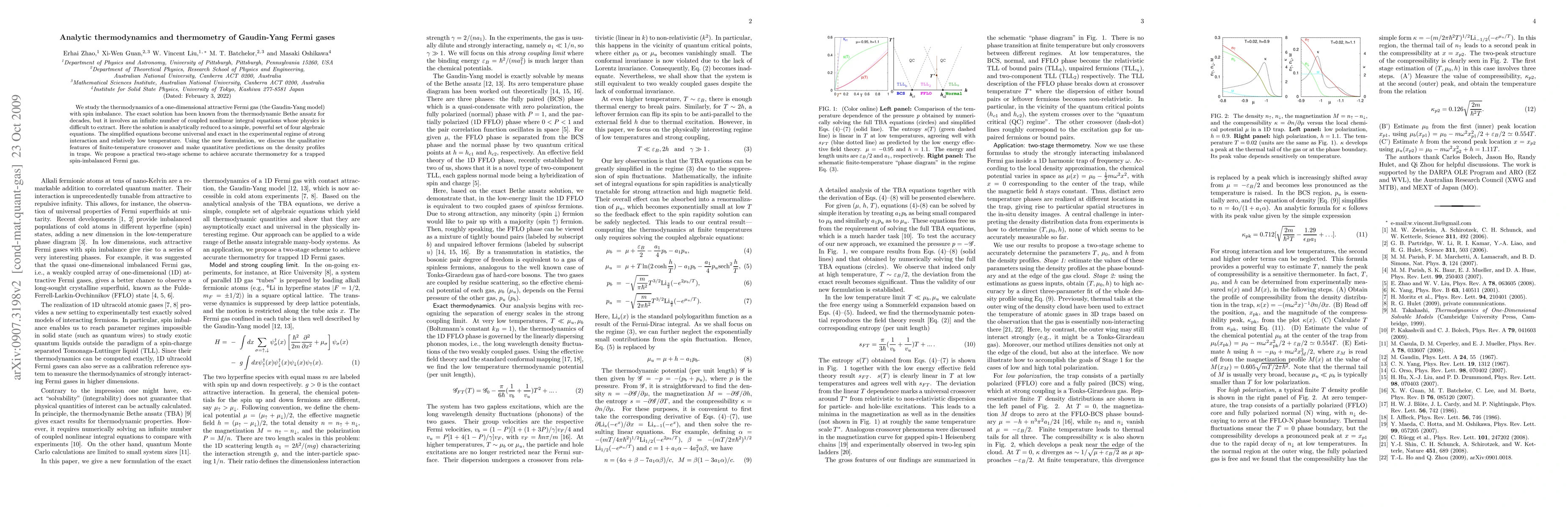 This paper presents an analytical reduction of the thermodynamic Bethe ansatz for the Gaudin-Yang model of spin-imbalanced Fermi gases, simplifying the exact solution into four algebraic equations. It proposes a practical two-stage thermometry scheme for trapped Fermi gases and discusses the density profiles and temperature crossover features.