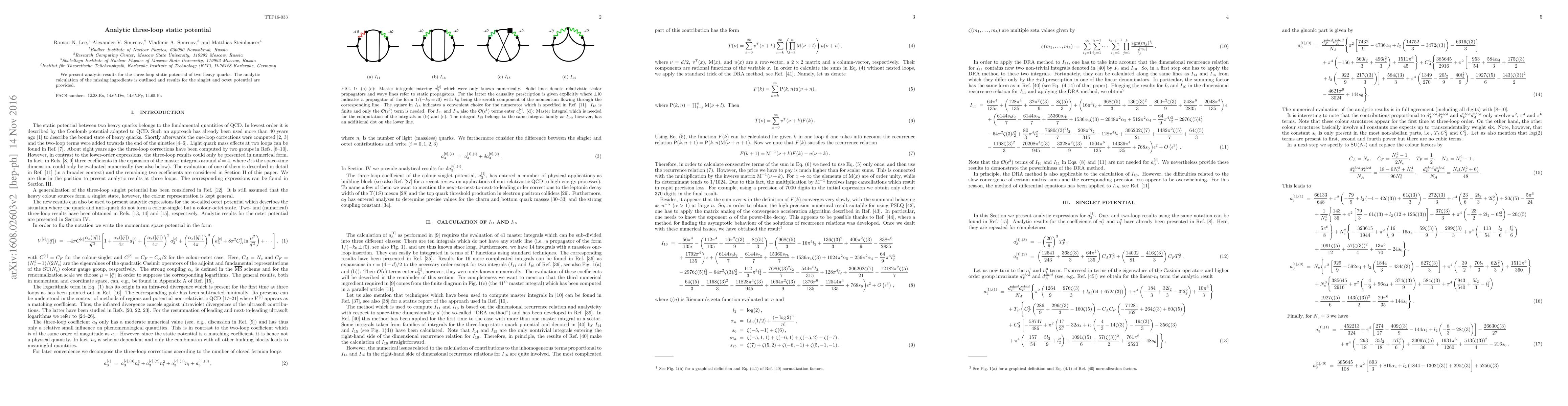 Researchers calculated the three-loop static potential for two heavy quarks using analytic methods, providing results for singlet and octet potentials.