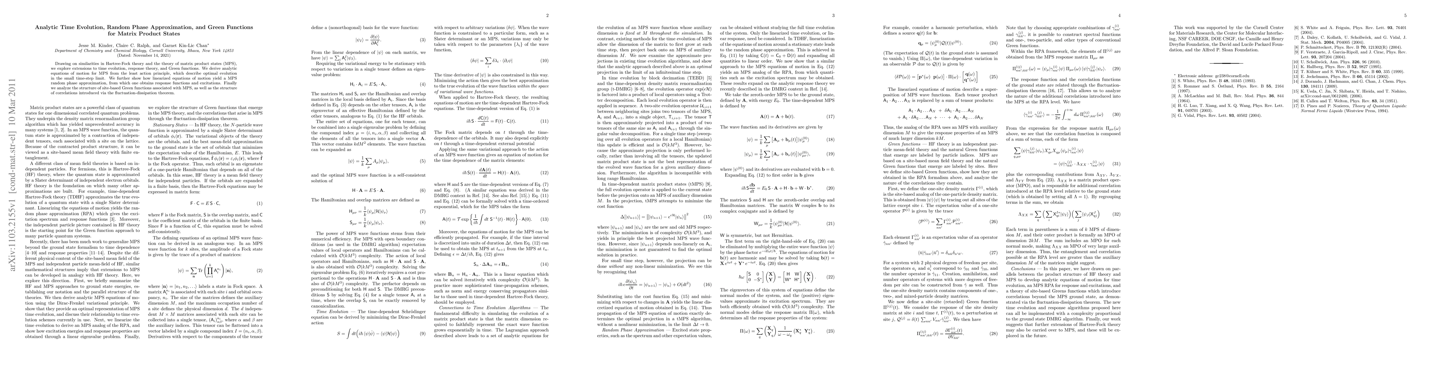 Drawing on similarities in Hartree-Fock theory and the theory of matrix product states (MPS), we explore extensions to time evolution, response theory, and Green functions. We derive analytic equations of motion for MPS from the least action principle, which describe optimal evolution in the small time-step limit. We further show how linearized equations of motion yield a MPS random phase approximation, from which one obtains response functions and excitations. Finally we analyze the structure of site-based Green functions associated with MPS, as well as the structure of correlations introduced via the fluctuation-dissipation theorem.