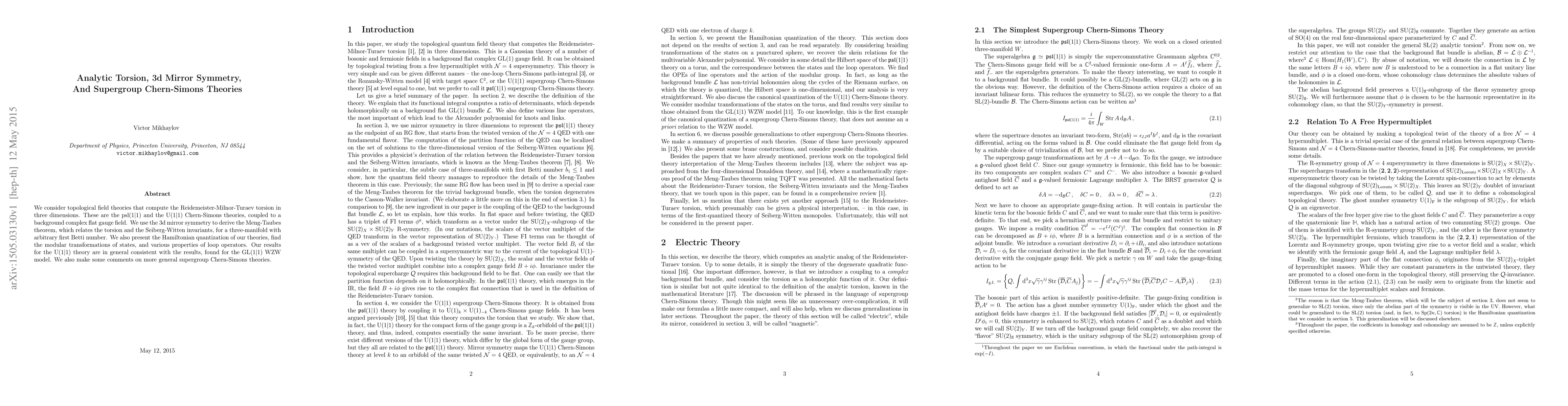 This paper investigates topological field theories computing the Reidemeister-Milnor-Turaev torsion using 3d mirror symmetry to derive the Meng-Taubes theorem relating torsion and Seiberg-Witten invariants. It also explores Hamiltonian quantization, modular transformations, and loop operators in the context of supergroup Chern-Simons theories.