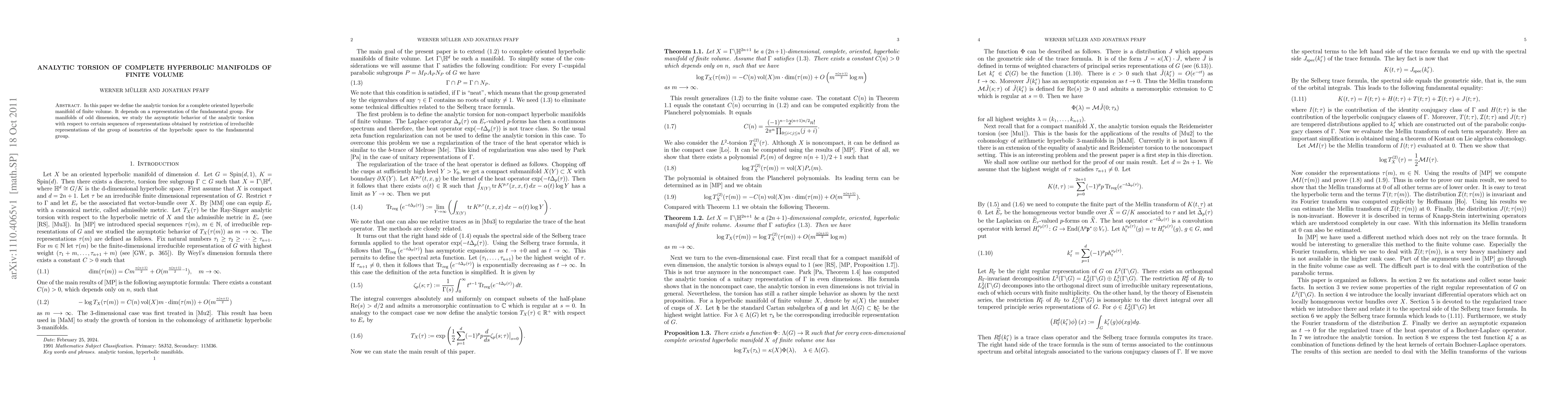 Summary: This paper defines analytic torsion for complete hyperbolic manifolds of finite volume and examines its asymptotic behavior in odd dimensions via representations of the fundamental group, specifically through restrictions of irreducible representations of the hyperbolic space isometry group.