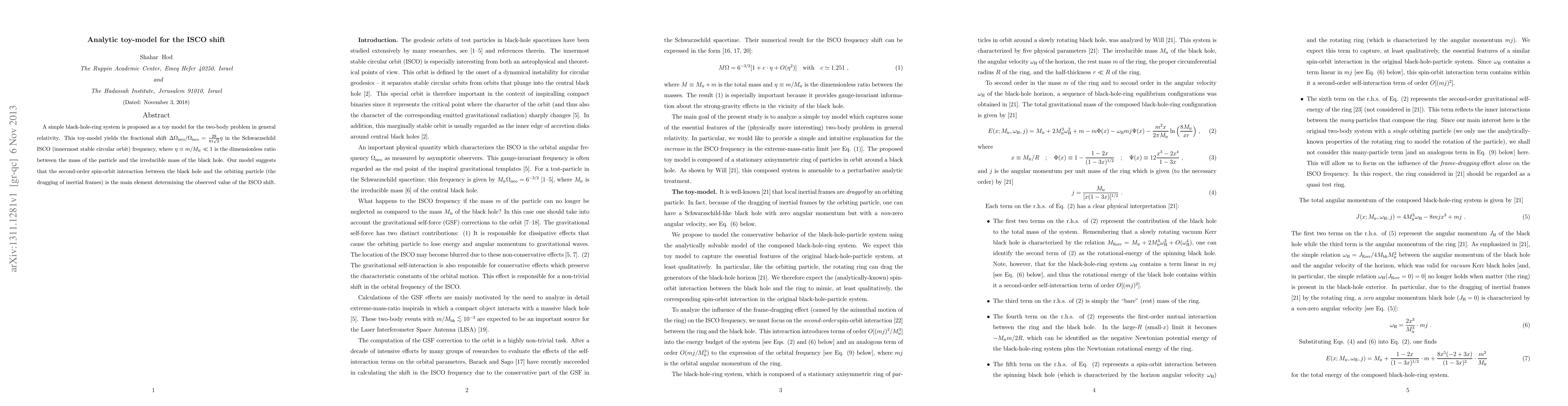 A simple black-hole-ring system is proposed as a toy model to study the ISCO shift in general relativity, showing that spin-orbit interaction determines its value.
