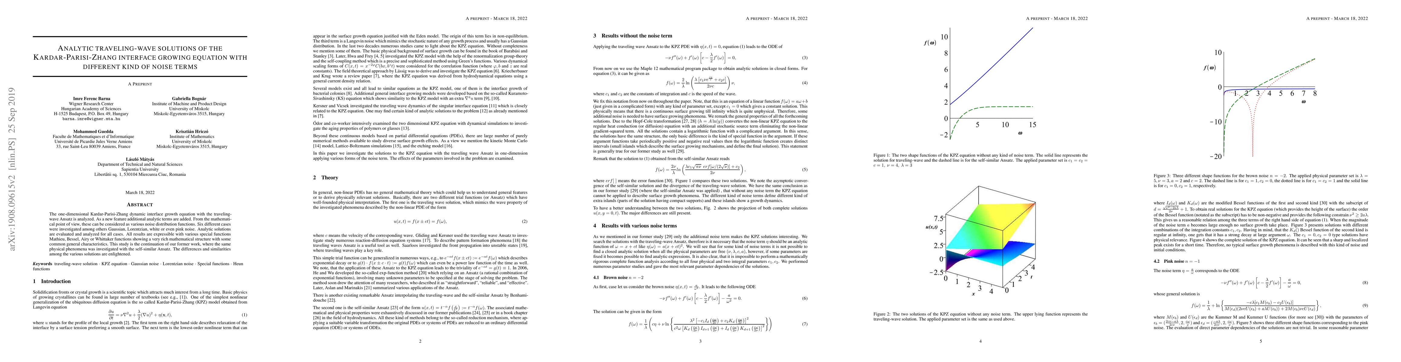 The one-dimensional Kardar-Parisi-Zhang dynamic interface growth equation with the traveling-wave Ansatz is analyzed. As a new feature additional analytic terms are added. From the mathematical point of view, these can be considered as various noise distribution functions. Six different cases were investigated among others Gaussian, Lorentzian, white or even pink noise. Analytic solutions are evaluated and analyzed for all cases. All results are expressible with various special functions Mathieu, Bessel, Airy or Whittaker functions showing a very rich mathematical structure with some common general characteristics. This study is the continuation of our former work, where the same physical phenomena was investigated with the self-similar Ansatz. The differences and similarities among the various solutions are enlightened.