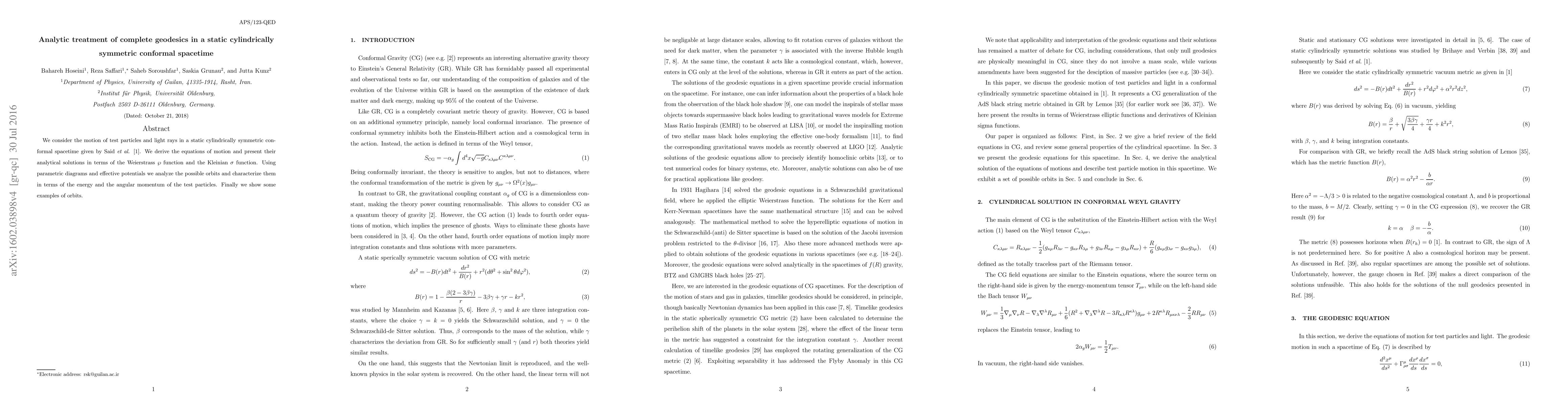We consider the motion of test particles and light rays in a static cylindrically symmetric conformal spacetime given by Said et al [1]. We derive the equations of motion and present their analytical solutions in terms of the Weierstrass {\wp} function and the Kleinian {\sigma} function. Using parametric diagrams and effective potentials we analyze the possible orbits and characterize them in terms of the energy and the angular momentum of the test particles. Finally we show some examples of orbits.