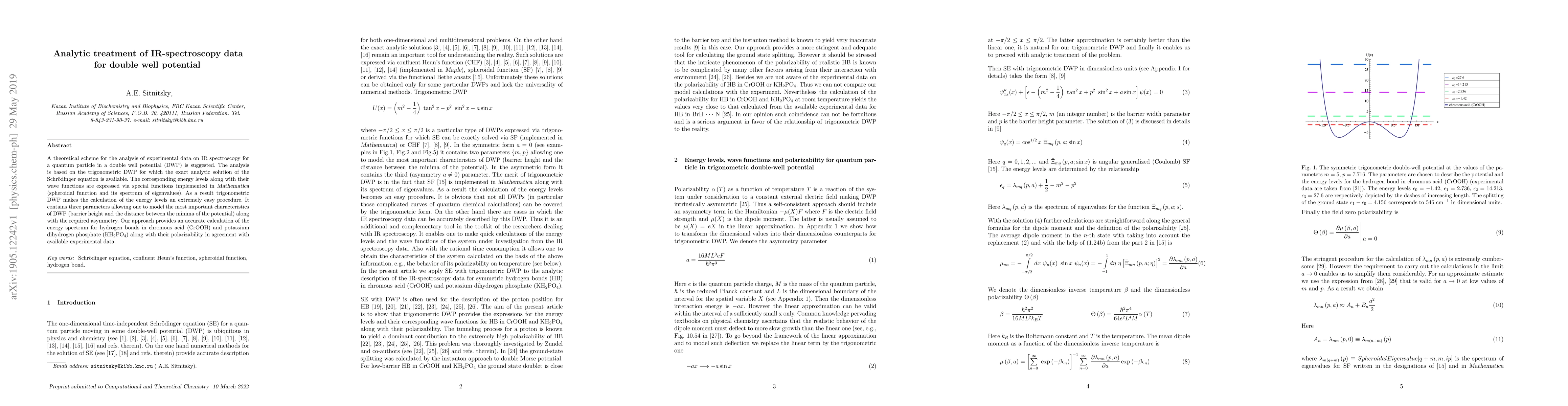 A theoretical scheme for the analysis of experimental data on IR spectroscopy for a quantum particle in a double well potential (DWP) is suggested. The analysis is based on the trigonometric DWP for which the exact analytic solution of the Schr\"odinger equation is available. The corresponding energy levels along with their wave functions are expressed via special functions implemented in {\sl {Mathematica}} (spheroidal function and its spectrum of eigenvalues). As a result trigonometric DWP makes the calculation of the energy levels an extremely easy procedure. It contains three parameters allowing one to model the most important characteristics of DWP (barrier height and the distance between the minima of the potential) along with the required asymmetry. Our approach provides an accurate calculation of the energy spectrum for hydrogen bonds in chromous acid (CrOOH) and potassium dihydrogen phosphate (${\rm{KH_2PO_4}}$) along with their polarizability in agreement with available experimental data.