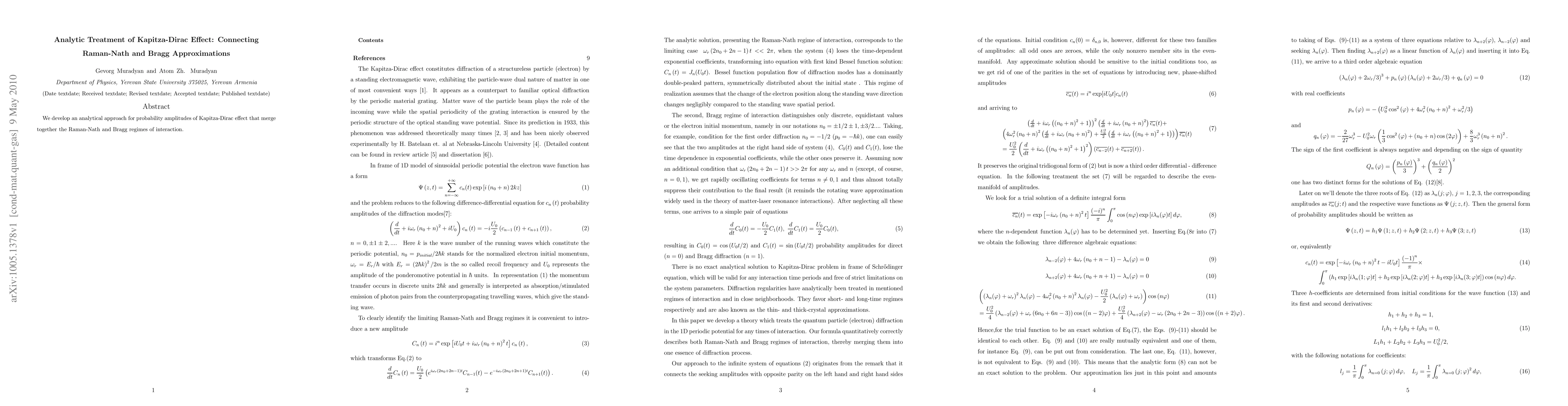 Summary: This paper presents an analytical framework for the Kapitza-Dirac effect, seamlessly integrating the Raman-Nath and Bragg interaction regimes through probability amplitude calculations. The approach provides a unified treatment of both regimes.