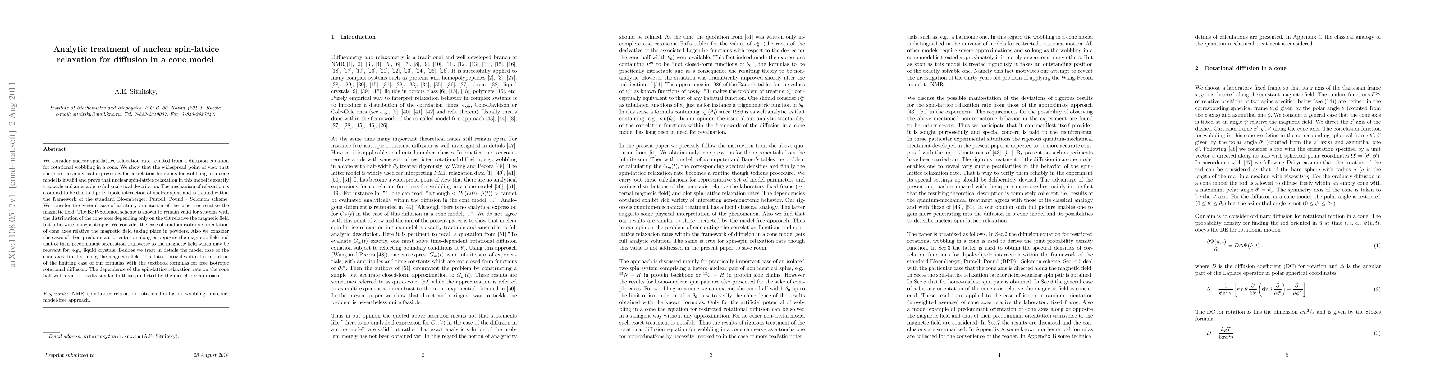 We consider nuclear spin-lattice relaxation rate resulted from a diffusion equation for rotational wobbling in a cone. We show that the widespread point of view that there are no analytical expressions for correlation functions for wobbling in a cone model is invalid and prove that nuclear spin-lattice relaxation in this model is exactly tractable and amenable to full analytical description. The mechanism of relaxation is assumed to be due to dipole-dipole interaction of nuclear spins and is treated within the framework of the standard Bloemberger, Purcell, Pound - Solomon scheme. We consider the general case of arbitrary orientation of the cone axis relative the magnetic field. The BPP-Solomon scheme is shown to remain valid for systems with the distribution of the cone axes depending only on the tilt relative the magnetic field but otherwise being isotropic. We consider the case of random isotropic orientation of cone axes relative the magnetic field taking place in powders. Also we consider the cases of their predominant orientation along or opposite the magnetic field and that of their predominant orientation transverse to the magnetic field which may be relevant for, e.g., liquid crystals. Besides we treat in details the model case of the cone axis directed along the magnetic field. The latter provides direct comparison of the limiting case of our formulas with the textbook formulas for free isotropic rotational diffusion. The dependence of the spin-lattice relaxation rate on the cone half-width yields results similar to those predicted by the model-free approach.