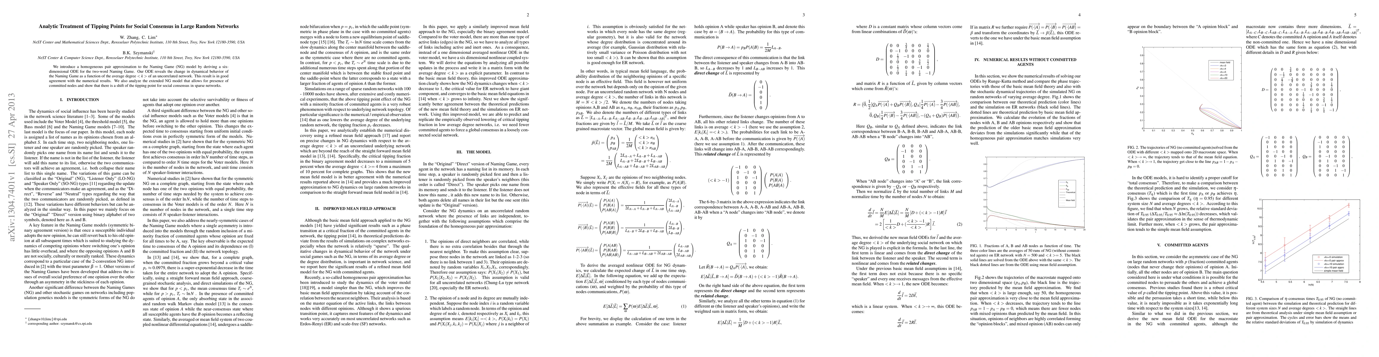 This paper develops a six-dimensional ODE for the Naming Game model, revealing how social consensus dynamics change with network connectivity. It finds a shift in the tipping point for consensus in sparse networks due to committed nodes, aligning well with numerical simulations.