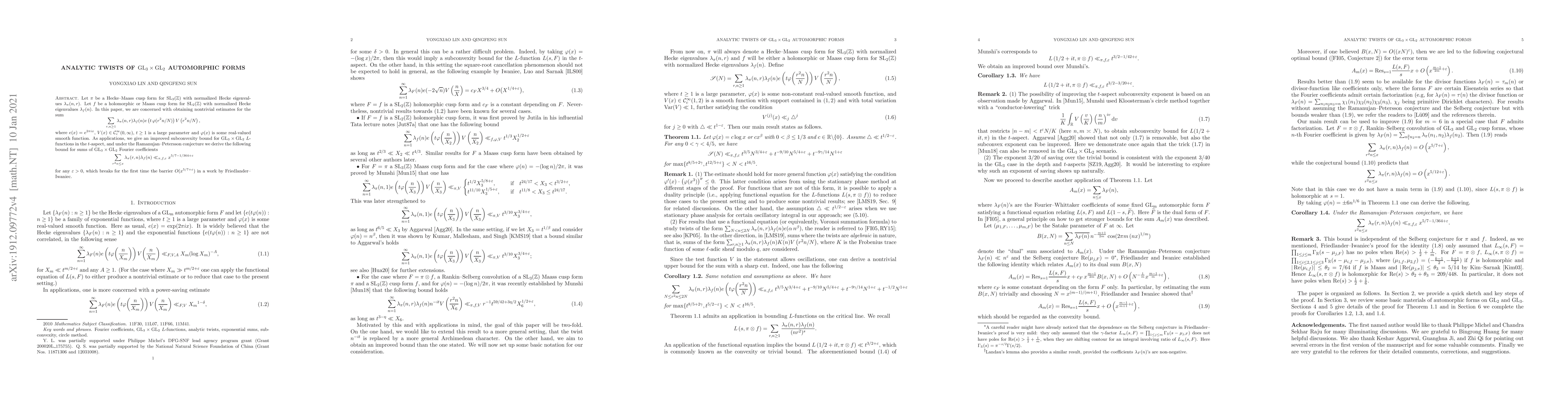 This paper investigates analytic twists of $\rm GL_3\times \rm GL_2$ automorphic forms, obtaining nontrivial estimates for a specific sum involving Fourier coefficients of cusp forms. It provides an improved subconvexity bound for $\rm GL_3\times \rm GL_2$ $L$-functions and a new bound for sums of Fourier coefficients, breaking the $O(x^{5/7+\varepsilon})$ barrier.