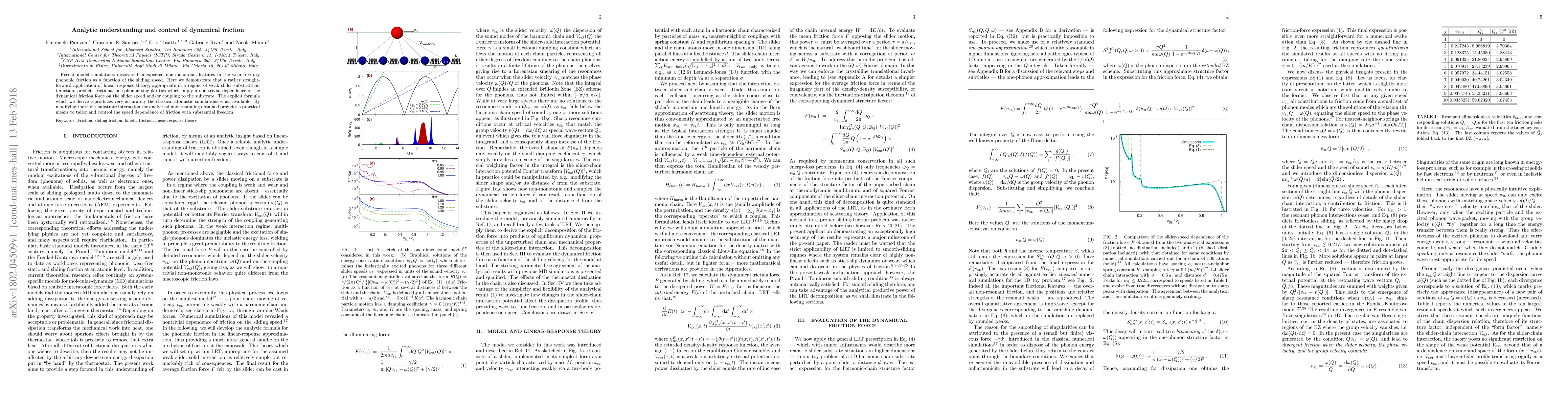 Recent model simulations discovered unexpected non-monotonic features in the wear-free dry phononic friction as a function of the sliding speed. Here we demonstrate that a rather straight- forward application of linear-response theory, appropriate in a regime of weak slider-substrate in- teraction, predicts frictional one-phonon singularities which imply a non-trivial dependence of the dynamical friction force on the slider speed and/or coupling to the substrate. The explicit formula which we derive reproduces very accurately the classical atomistic simulations when available. By modifying the slider-substrate interaction the analytical understanding obtained provides a practical means to tailor and control the speed dependence of friction with substantial freedom.