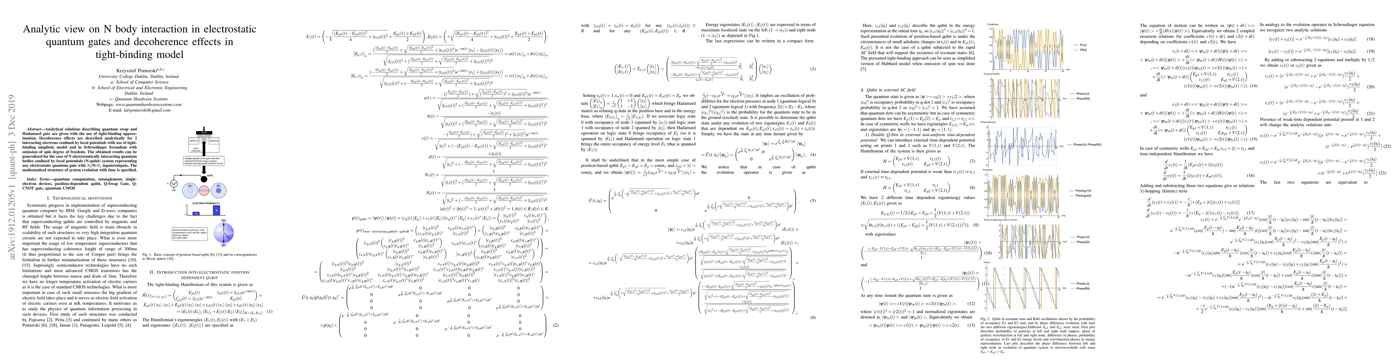 Analytical solutions describing quantum swap and Hadamard gate are given with the use of tight-binding approximation. Decoherence effects are described analytically for two interacting electrons confined by local potentials with use of tight-binding simplistic model and in Schroedinger formalism with omission of spin degree of freedom. The obtained results can be generalized for the case of N electrostatically interacting quantum bodies confined by local potentials (N-qubit) system representing any electrostatic quantum gate with N1/N-N1 inputs/outputs. The mathematical structure of system evolution with time is specified. Index Terms: quantum computation, entanglement, single-electron devices, position-dependent qubit, Q-Swap Gate, quantum CMOS