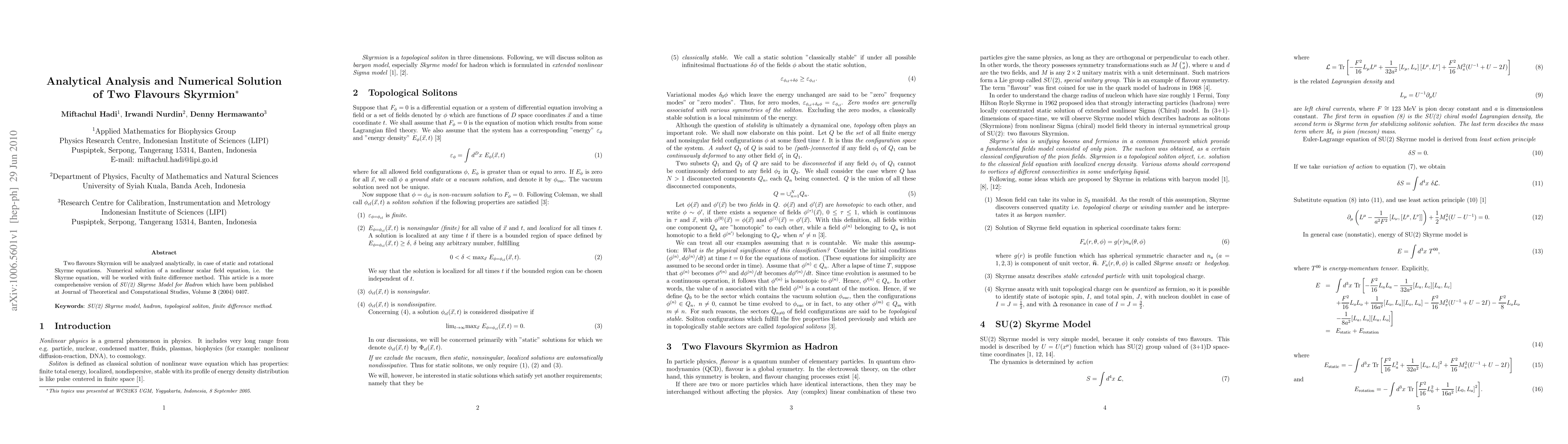 Two flavours Skyrmion will be analyzed analytically, in case of static and rotational Skyrme equations. Numerical solution of a nonlinear scalar field equation, i.e. the Skyrme equation, will be worked with finite difference method. This article is a more comprehensive version of \textit{SU(2) Skyrme Model for Hadron} which have been published at Journal of Theoretical and Computational Studies, Volume \textbf{3} (2004) 0407.