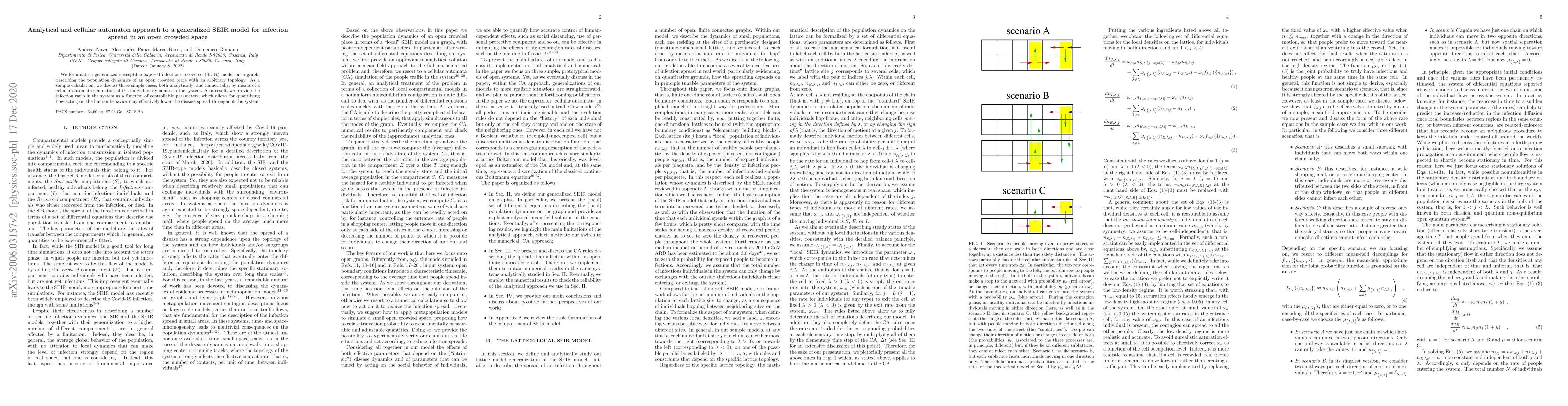 We formulate a generalized susceptible exposed infectious recovered (SEIR) model on a graph, describing the population dynamics of an open crowded place with an arbitrary topology. As a sample calculation, we discuss three simple cases, both analytically, and numerically, by means of a cellular automata simulation of the individual dynamics in the system. As a result, we provide the infection ratio in the system as a function of controllable parameters, which allows for quantifying how acting on the human behavior may effectively lower the disease spread throughout the system.