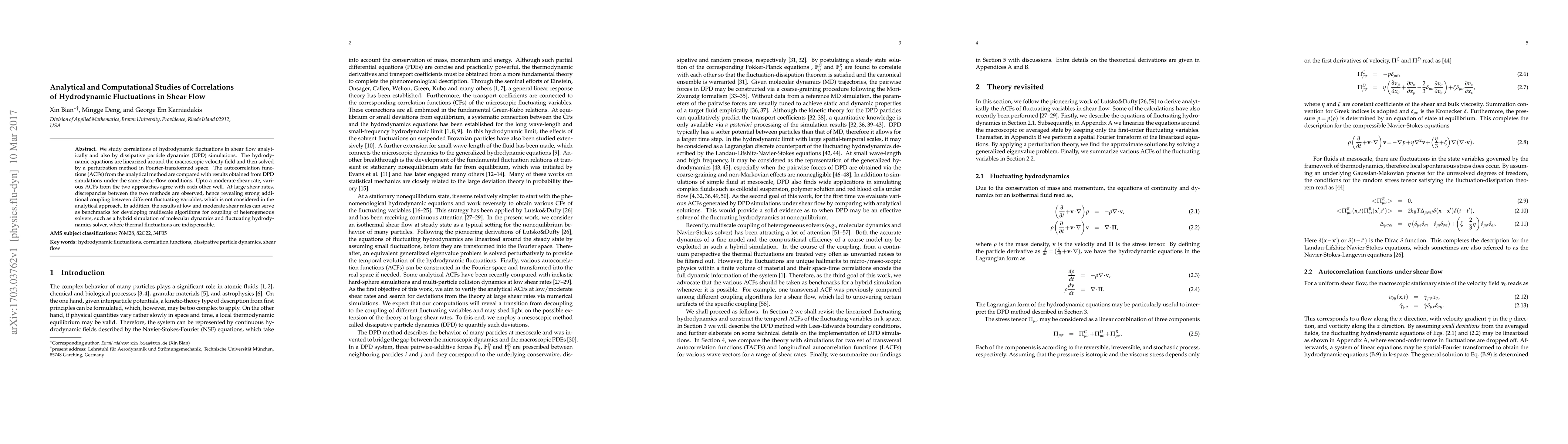 This paper investigates correlations of hydrodynamic fluctuations in shear flow using both analytical methods and dissipative particle dynamics (DPD) simulations. The analytical approach shows good agreement with DPD results at moderate shear rates, but discrepancies at high shear rates indicate stronger coupling not captured by the analytical method. The results provide benchmarks for developing multiscale algorithms for hybrid molecular dynamics and hydrodynamic solvers.