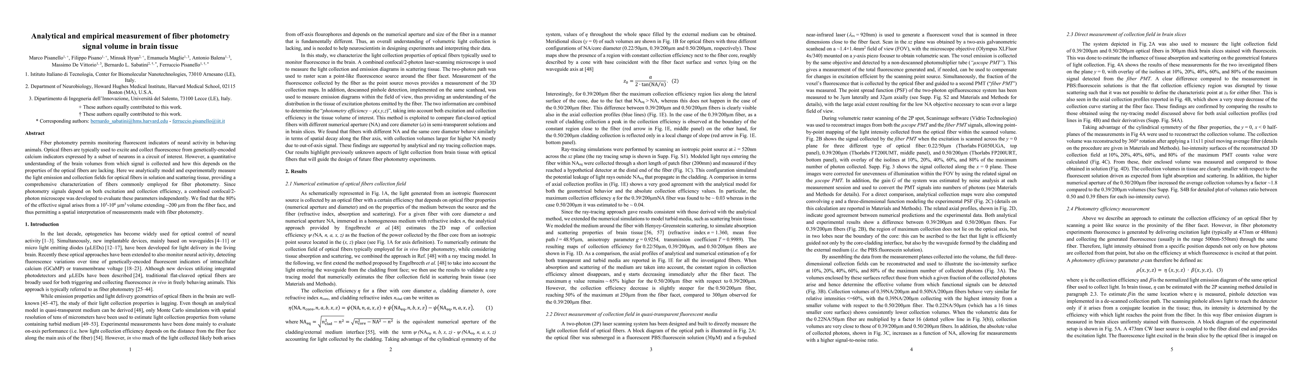 This paper analytically and empirically measures the brain volume from which fiber photometry signals are collected, revealing that 80% of the signal originates from a 10^5-10^6 um³ volume ~200 um from the fiber face. The study combines confocal/2-photon microscopy to evaluate excitation and collection efficiency, providing a comprehensive characterization of optical fiber use in fiber photometry.