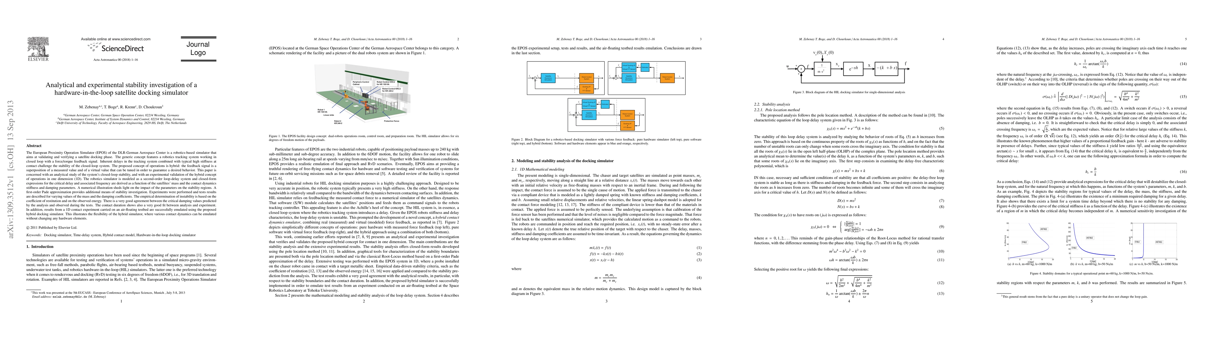 The European Proximity Operation Simulator (EPOS) of the DLR-German Aerospace Center is a robotics-based simulator that aims at validating and verifying a satellite docking phase. The generic concept features a robotics tracking system working in closed loop with a force/torque feedback signal. Inherent delays in the tracking system combined with typical high stiffness at contact challenge the stability of the closed-loop system. The proposed concept of operations is hybrid: the feedback signal is a superposition of a measured value and of a virtual value that can be tuned in order to guarantee a desired behavior. This paper is concerned with an analytical study of the system's closed-loop stability, and with an experimental validation of the hybrid concept of operations in one dimension (1D). The robotics simulator is modeled as a second-order loop-delay system and closed-form expressions for the critical delay and associated frequency are derived as a function of the satellites' mass and the contact dynamics stiffness and damping parameters. A numerical illustration sheds light on the impact of the parameters on the stability regions. A first-order Pade approximation provides additional means of stability investigation. Experiments were performed and tests results are described for varying values of the mass and the damping coefficients. The empirical determination of instability is based on the coefficient of restitution and on the observed energy. There is a very good agreement between the critical damping values predicted by the analysis and observed during the tests...