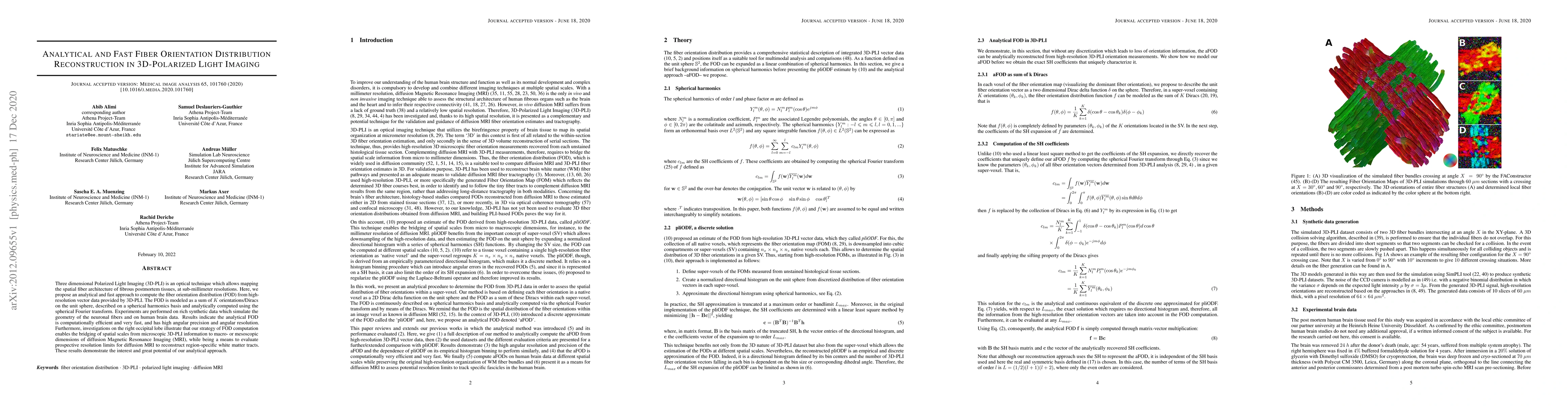 This paper proposes an analytical and fast method for computing fiber orientation distribution (FOD) from 3D-PLI data, modeling FOD as a sum of K orientations using spherical harmonics and spherical Fourier transform. The approach demonstrates high computational efficiency, precision, and resolution, and bridges microscopic 3D-PLI data to macro-scale diffusion MRI, showing potential for reconstructing white matter tracts.