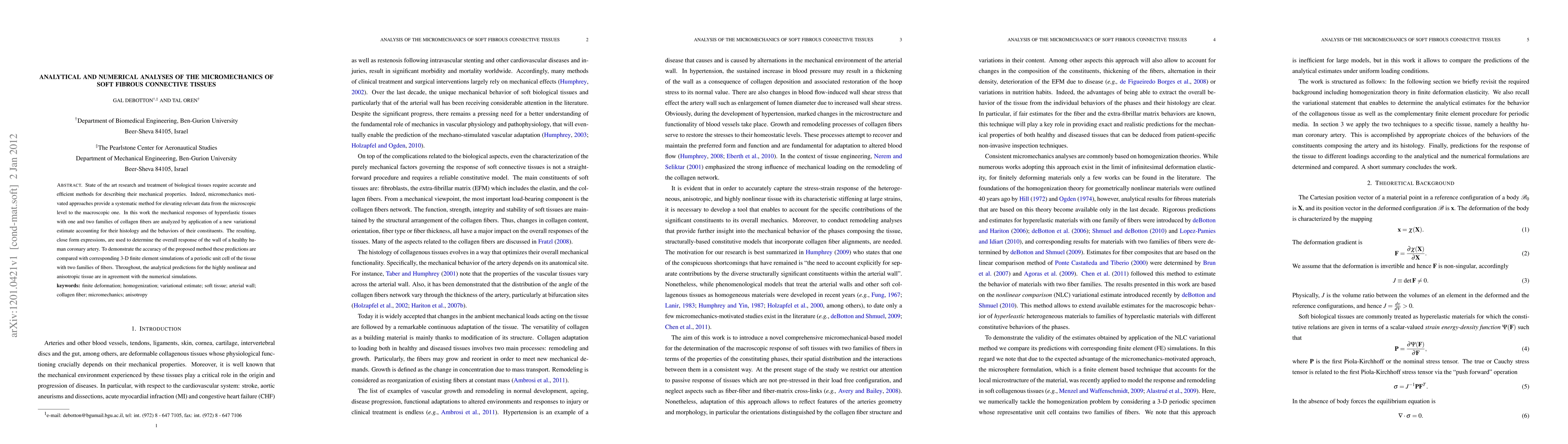 State of the art research and treatment of biological tissues require accurate and efficient methods for describing their mechanical properties. Indeed, micromechanics motivated approaches provide a systematic method for elevating relevant data from the microscopic level to the macroscopic one. In this work the mechanical responses of hyperelastic tissues with one and two families of collagen fibers are analyzed by application of a new variational estimate accounting for their histology and the behaviors of their constituents. The resulting, close form expressions, are used to determine the overall response of the wall of a healthy human coronary artery. To demonstrate the accuracy of the proposed method these predictions are compared with corresponding 3-D finite element simulations of a periodic unit cell of the tissue with two families of fibers. Throughout, the analytical predictions for the highly nonlinear and anisotropic tissue are in agreement with the numerical simulations.