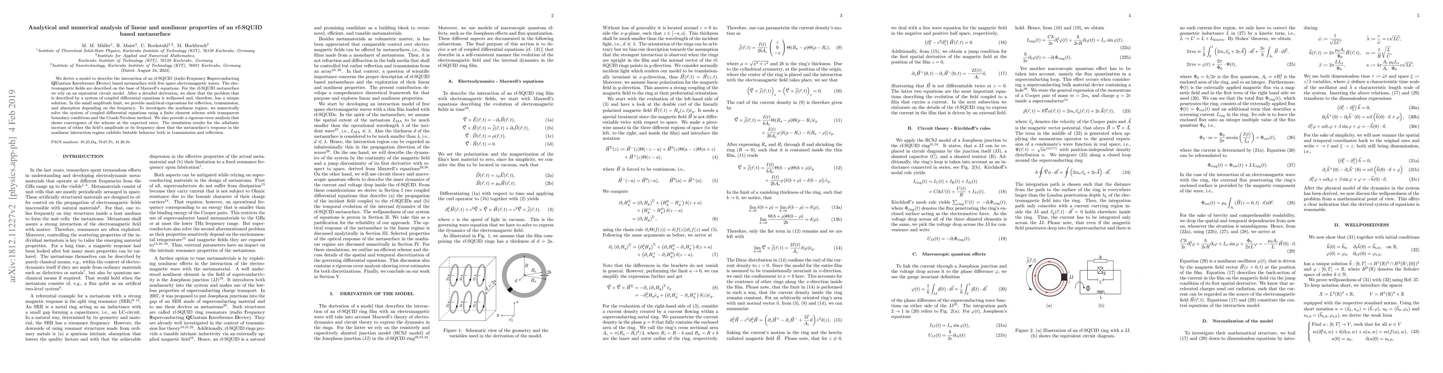 This paper develops an analytical and numerical model for an rf-SQUID based metasurface, showing unique solutions for linear interactions and bistable behavior in the nonlinear regime through finite element simulations. The study provides analytical expressions for electromagnetic wave interactions and rigorous error analysis for numerical methods.