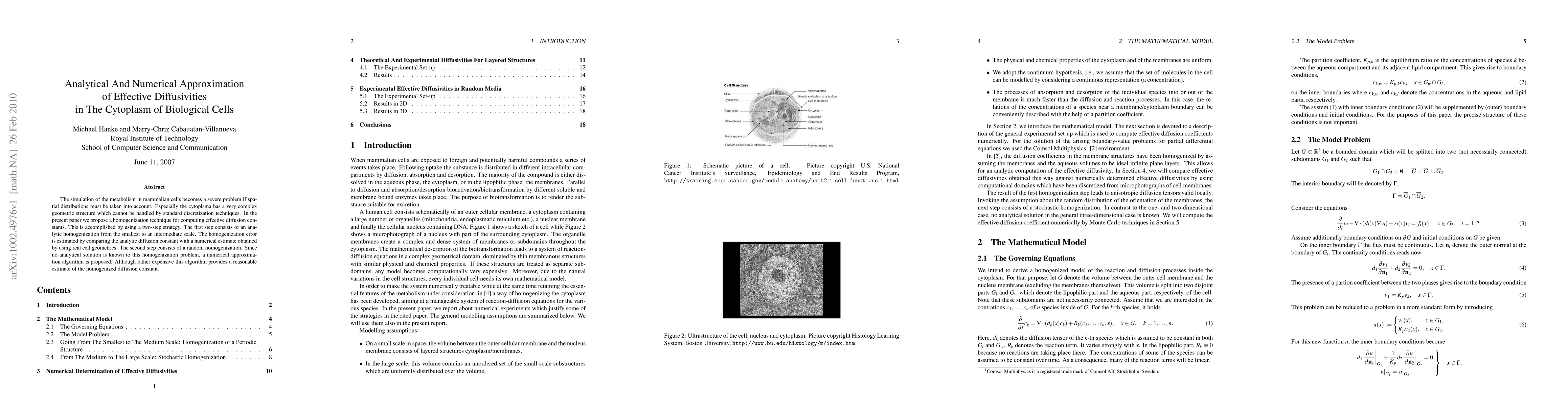 The simulation of the metabolism in mammalian cells becomes a severe problem if spatial distributions must be taken into account. Especially the cytoplasm has a very complex geometric structure which cannot be handled by standard discretization techniques. In the present paper we propose a homogenization technique for computing effective diffusion constants. This is accomplished by using a two-step strategy. The first step consists of an analytic homogenization from the smallest to an intermediate scale. The homogenization error is estimated by comparing the analytic diffusion constant with a numerical estimate obtained by using real cell geometries. The second step consists of a random homogenization. Since no analytical solution is known to this homogenization problem, a numerical approximation algorithm is proposed. Although rather expensive this algorithm provides a reasonable estimate of the homogenized diffusion constant.