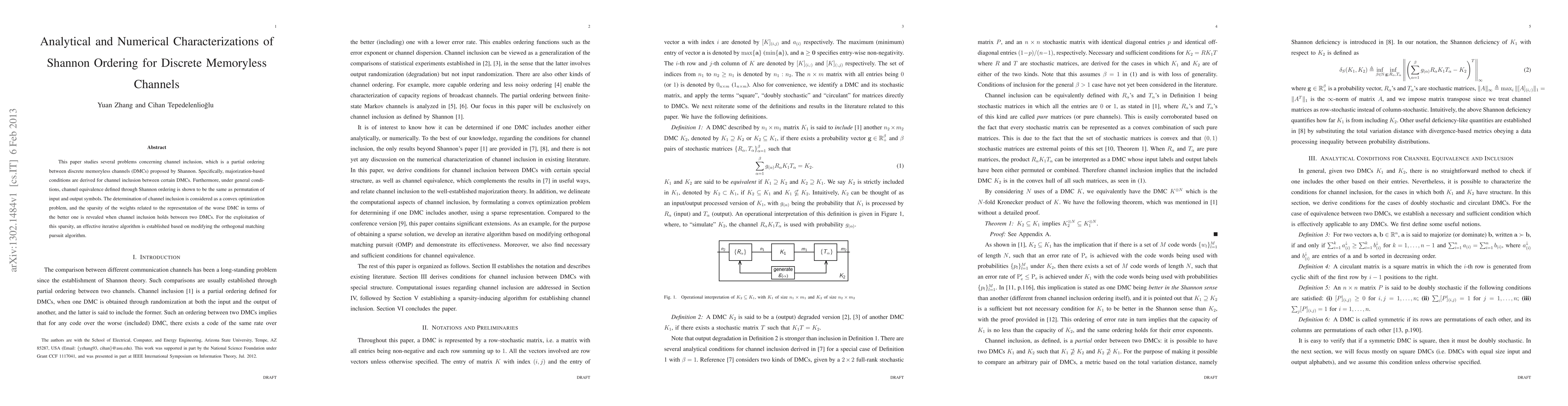 This paper derives majorization-based conditions for channel inclusion in discrete memoryless channels and shows that Shannon ordering equates to symbol permutation equivalence. It also proposes a convex optimization approach for determining channel inclusion and an iterative algorithm leveraging sparsity for efficient computation.
