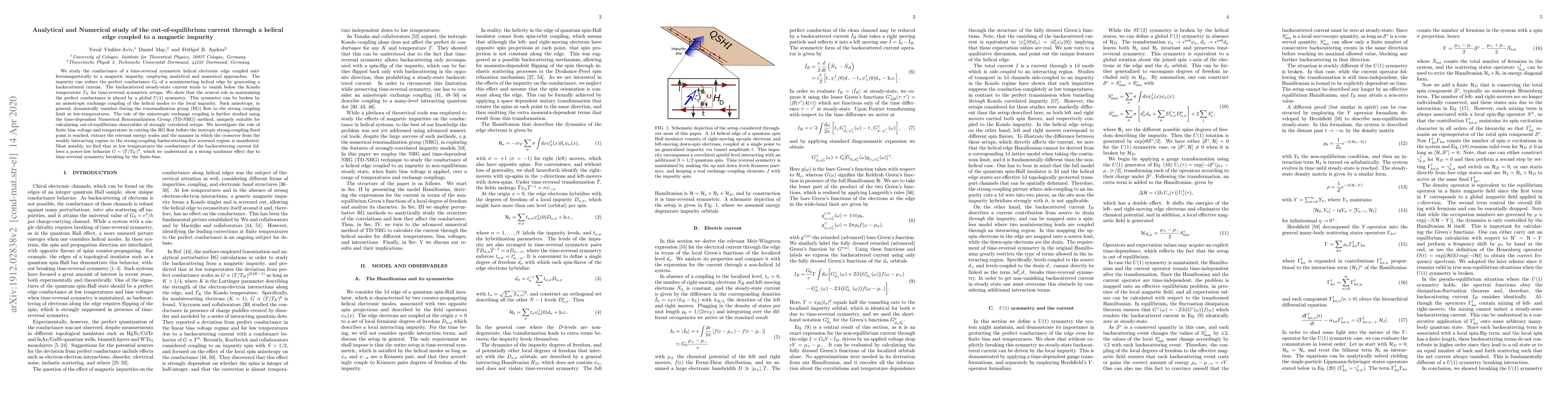 This paper investigates the conductance of a helical edge coupled to a magnetic impurity using analytical and numerical methods, showing that a global $U(1)$ symmetry preserves perfect conductance. The study reveals that anisotropic exchange coupling can break this symmetry, and employs the TD-NRG method to explore the effects of finite bias and temperature, finding a power-law behavior in the conductance at low temperatures.