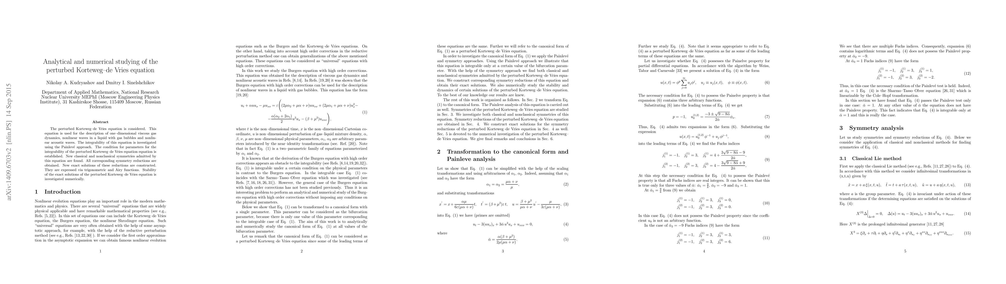 The perturbed Korteweg--de Vries equation is considered. This equation is used for the description of one--dimensional viscous gas dynamics, nonlinear waves in a liquid with gas bubbles and nonlinear acoustic waves. The integrability of this equation is investigated using the Painlev\'e approach. The condition for parameters for the integrability of the perturbed Korteweg--de Vries equation equation is established. New classical and nonclassical symmetries admitted by this equation are found. All corresponding symmetry reductions are obtained. New exact solutions of these reductions are constructed. They are expressed via trigonometric and Airy functions. Stability of the exact solutions of the perturbed Korteweg--de Vries equation is investigated numerically.