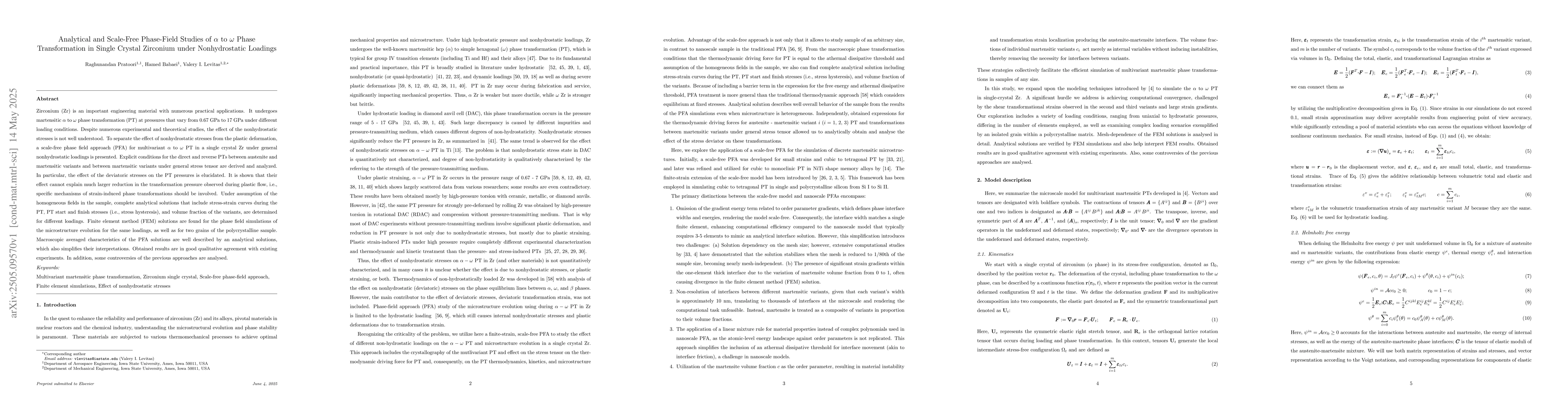 The development and application of a scale-free phase-field approach (PFA) to analyze the α to ω phase transformation in single crystal zirconium under general nonhydrostatic loadings, providing analytical solutions for stress-strain curves, transformation start and finish stresses, and volume fraction of variants.