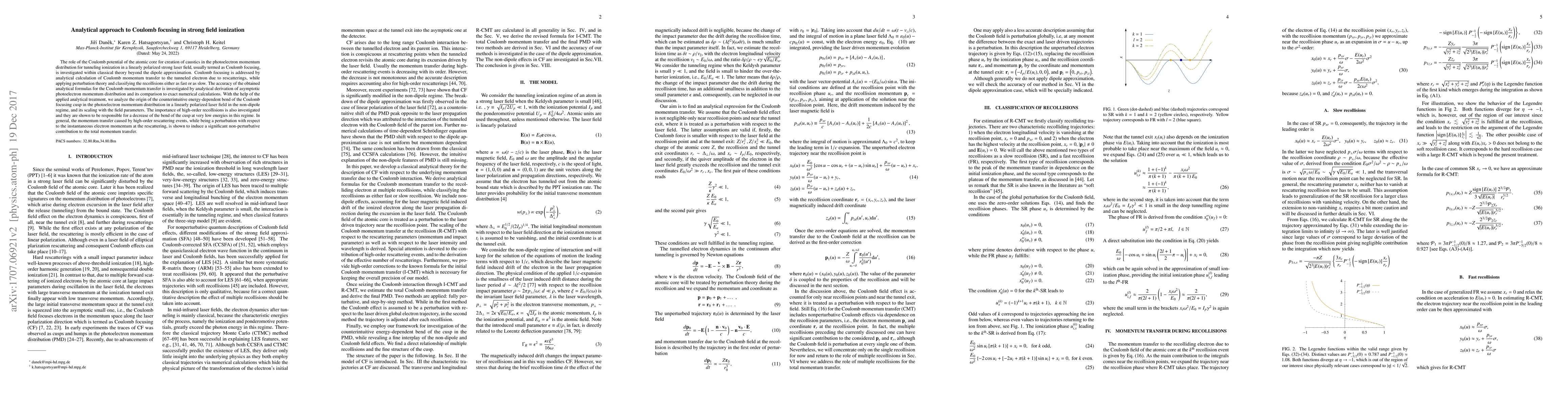 The role of the Coulomb potential of the atomic core for creation of caustics in the photoelectron momentum distribution for tunneling ionization in a linearly polarized strong laser field, usually termed as Coulomb focusing, is investigated within classical theory beyond the dipole approximation. Coulomb focusing is addressed by analytical calculation of Coulomb momentum transfer to the tunneled electron due to rescatterings, while applying perturbation theory and classifying the recollisions either as fast or as slow. The accuracy of the obtained analytical formulas for the Coulomb momentum transfer is investigated by analytical derivation of asymptotic photoelectron momentum distribution and its comparison to exact numerical calculations. With the help of the applied analytical treatment, we analyze the origin of the counterintuitive energy-dependent bend of the Coulomb focusing cusp in the photoelectron momentum distribution in a linearly polarized laser field in the non-dipole regime, and its scaling with the field parameters. The importance of high-order recollisions is also investigated and they are shown to be responsible for a decrease of the bend of the cusp at very low energies in this regime. In general, the momentum transfer caused by high-order rescattering events, while being a perturbation with respect to the instantaneous electron momentum at the rescattering, is shown to induce a significant non-perturbative contribution to the total momentum transfer.