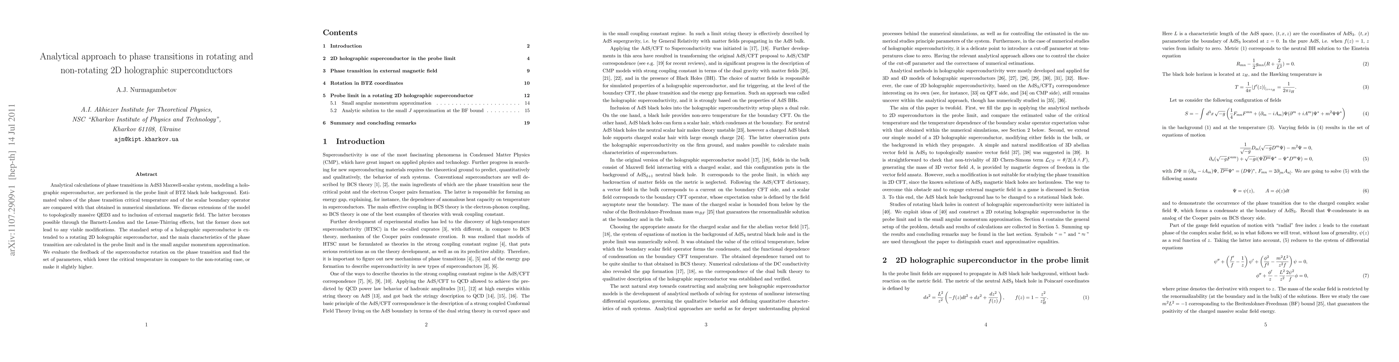 Analytical calculations of phase transitions in AdS3 Maxwell-scalar system, modeling a holographic superconductor, are performed in the probe limit of BTZ black hole background. Estimated values of the phase transition critical temperature and of the scalar boundary operator are compared with that obtained in numerical simulations. We discuss extensions of the model to topologically massive QED3 and to inclusion of external magnetic field. The latter becomes possible through the Barnett-London and the Lense-Thirring effects, but the former does not lead to any viable modifications. The standard setup of a holographic superconductor is extended to a rotating 2D holographic superconductor, and the main characteristics of the phase transition are calculated in the probe limit and in the small angular momentum approximation. We evaluate the feedback of the superconductor rotation on the phase transition and find the set of parameters, which lower the critical temperature in compare to the non-rotating case, or make it slightly higher.