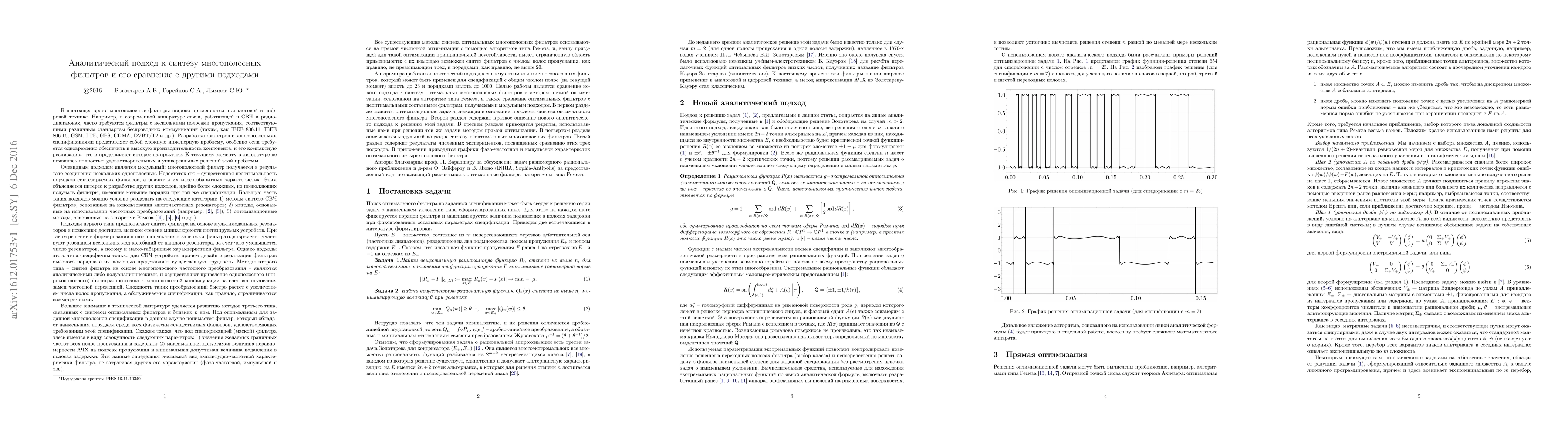 A novel analytical approach to the synthesis of electrical (e.g. analogue, digital or microwave) filters is proposed. This approach allows to obtain lowest possible degree filters with given involved specification including e.g. many pass and stop bands, narrow transition bands, high attenuation at the stop bands and low magnitude oscillations at the pass bands. Comparison to other existing approaches is given.