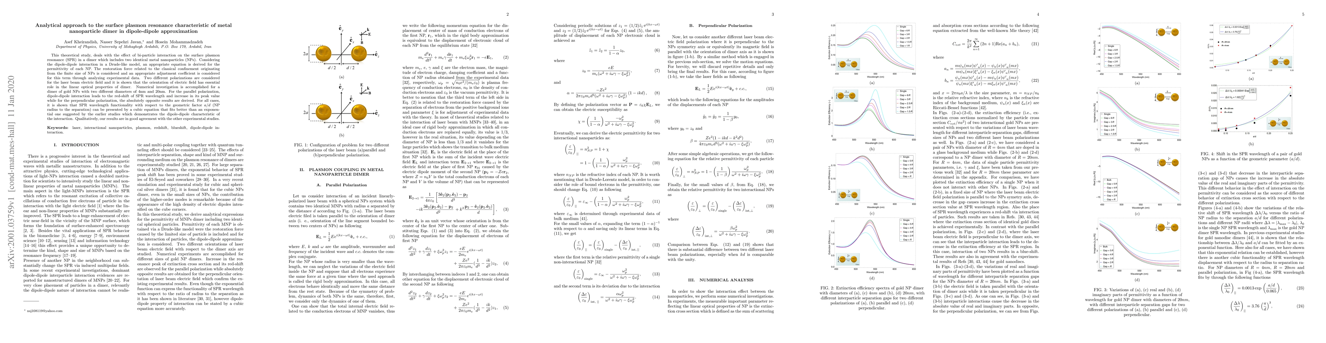 This study investigates the surface plasmon resonance of metal nanoparticle dimers in a dipole-dipole approximation, revealing that dipole-dipole interaction affects SPR wavelength and peak value depending on electric field polarization.
