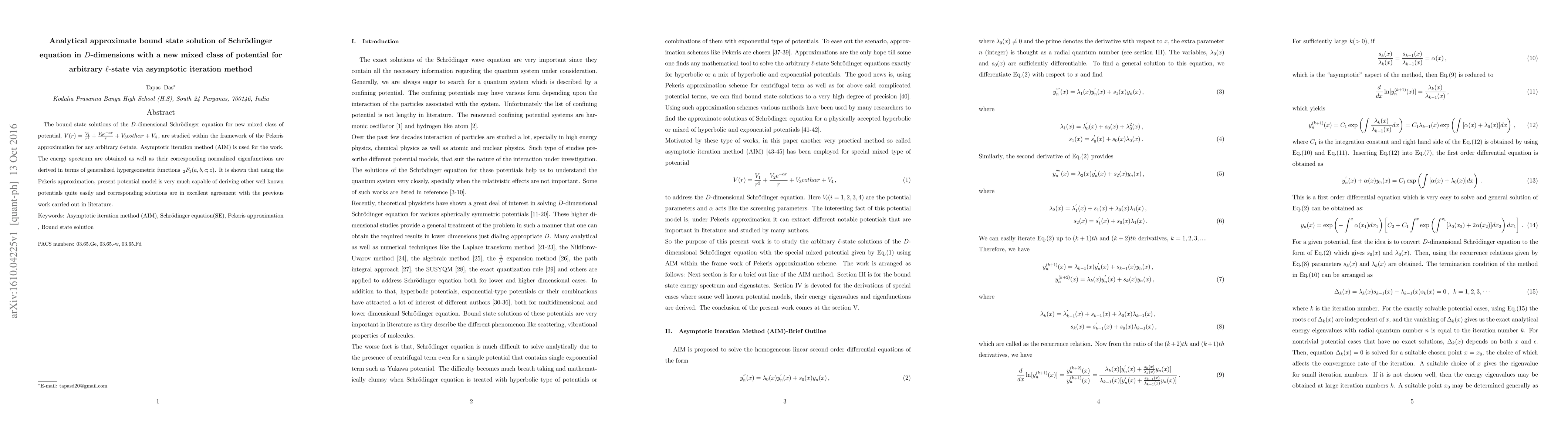 The bound state solutions of the $D$-dimensional Schr\"{o}dinger equation for new mixed class of potential, $V(r)=\frac{V_1}{r^2}+\frac{V_2e^{-\alpha r}}{r}+V_3coth\alpha r+V_4\,,$ are studied within the framework of the Pekeris approximation for any arbitrary $\ell$-state. Asymptotic iteration method (AIM) is used for the work. The energy spectrum are obtained as well as their corresponding normalized eigenfunctions are derived in terms of generalized hypergeometric functions $\,_{2}F_{1}(a,b,c;z)$. It is shown that using the Pekeris approximation, present potential model is very much capable of deriving other well known potentials quite easily and corresponding solutions are in excellent agreement with the previous work carried out in literature.