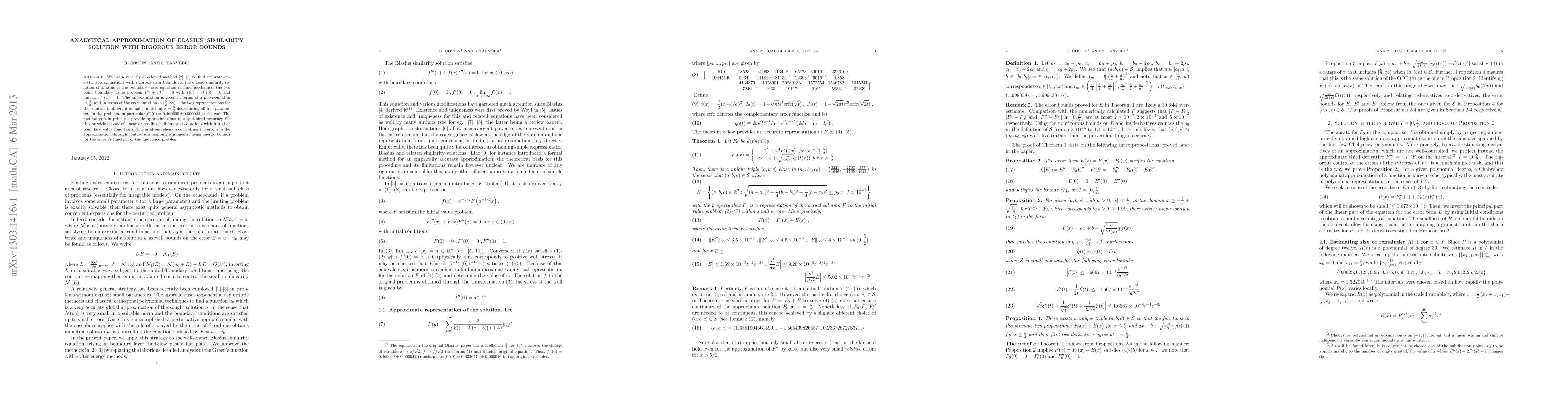 We use a recently developed method \cite{Costinetal}, \cite{Dubrovin} to find accurate analytic approximations with rigorous error bounds for the classic similarity solution of Blasius of the boundary layer equation in fluid mechanics, the two point boundary value problem $f^{\prime \prime \prime} + f f^{\prime \prime} =0$ with $f(0)=f^\prime (0)=0$ and $\lim_{x \rightarrow \infty} f^\prime (x) =1$. The approximation is given in terms of a polynomial in $[0, \frac{5}{2}]$ and in terms of the error function in $[\frac{5}{2}, \infty)$. The two representations for the solution in different domains match at $x=\frac{5}{2}$ determining all free parameters in the problem, in particular $f^{\prime \prime} (0) =0.469600 \pm 0.000022 $ at the wall The method can in principle provide approximations to any desired accuracy for this or wide classes of linear or nonlinear differential equations with initial or boundary value conditions. The analysis relies on controlling the errors in the approximation through contraction mapping arguments, using energy bounds for the Green's function of the linearized problem.