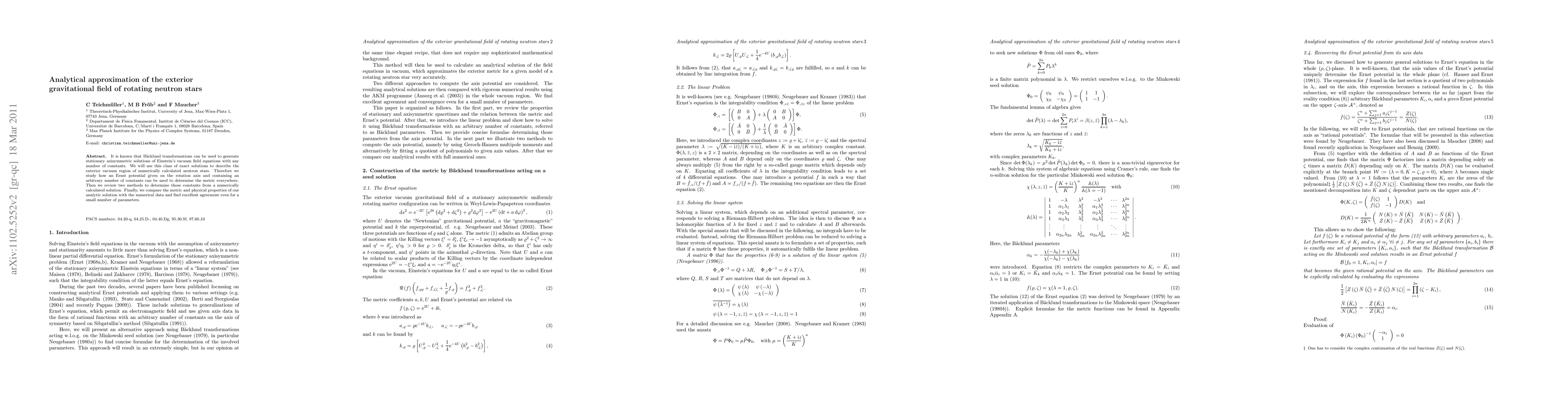 This paper utilizes Bäcklund transformations to create stationary axisymmetric solutions for neutron star exterior fields, approximating numerical solutions with excellent agreement using few parameters. It outlines methods to determine constants from numerical solutions and compares metric properties.