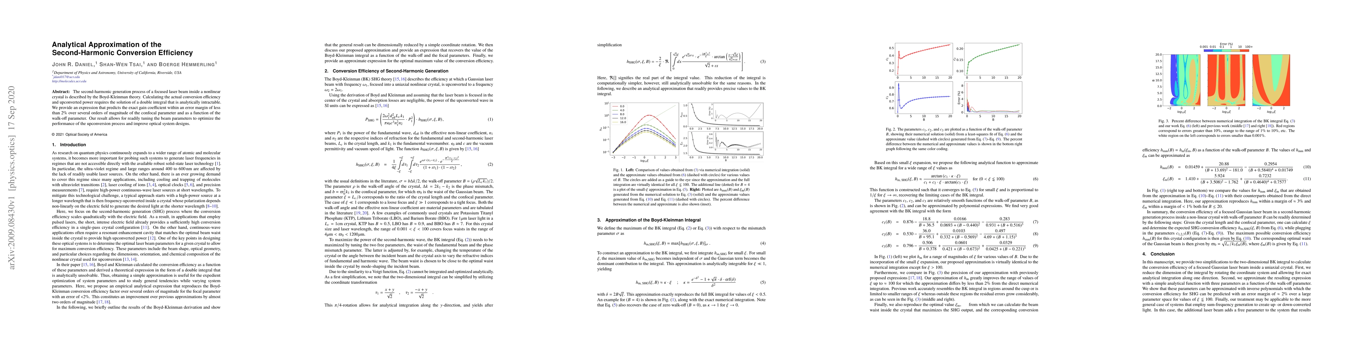 The second-harmonic generation process of a focused laser beam inside a nonlinear crystal is described by the Boyd-Kleinman theory. Calculating the actual conversion efficiency and upconverted power requires the solution of a double integral that is analytically intractable. We provide an expression that predicts the exact gain coefficient within an error margin of less than 2% over several orders of magnitude of the confocal parameter and as a function of the walk-off parameter. Our result allows for readily tuning the beam parameters to optimize the performance of the upconversion process and improve optical system designs.