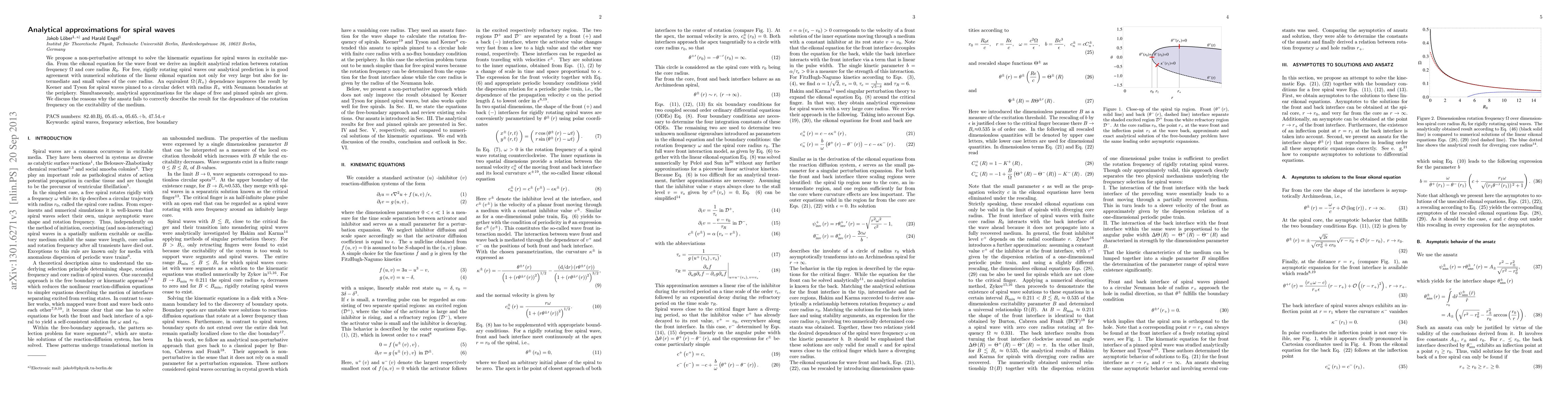 We propose a non-perturbative attempt to solve the kinematic equations for spiral waves in excitable media. From the eikonal equation for the wave front we derive an implicit analytical relation between rotation frequency $\Omega$ and core radius $R_{0}$. For free, rigidly rotating spiral waves our analytical prediction is in good agreement with numerical solutions of the linear eikonal equation not only for very large but also for intermediate and small values of the core radius. An equivalent $\Omega\left(R_{+}\right)$ dependence improves the result by Keener and Tyson for spiral waves pinned to a circular defect with radius $R_{+}$ with Neumann boundaries at the periphery. Simultaneously, analytical approximations for the shape of free and pinned spirals are given. We discuss the reasons why the ansatz fails to correctly describe the result for the dependence of the rotation frequency on the excitability of the medium.
