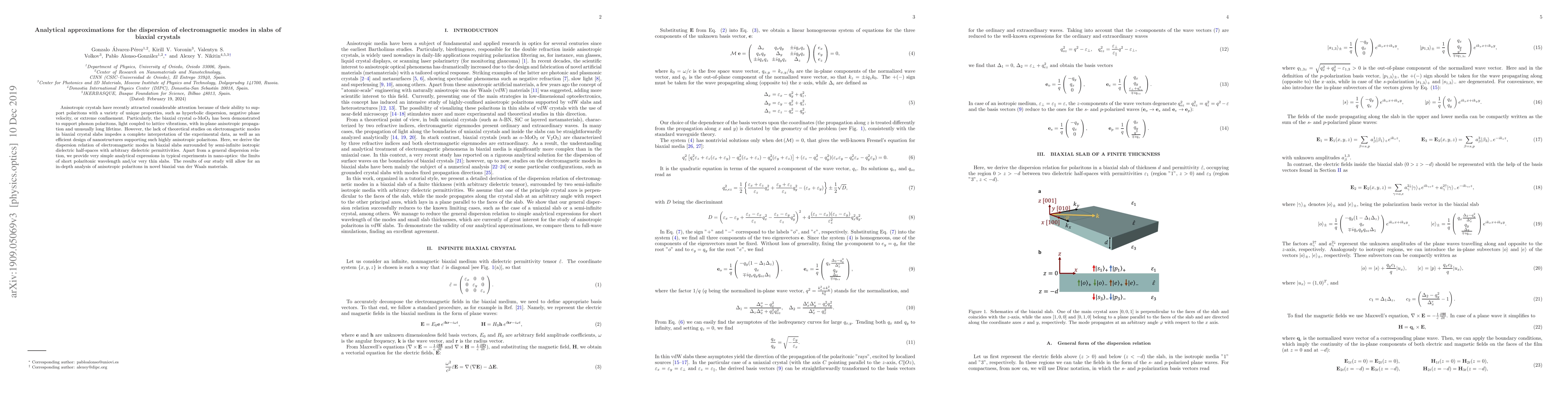 This paper derives analytical approximations for the dispersion of electromagnetic modes in biaxial crystal slabs, focusing on $\alpha$-MoO$_3$. It provides simple analytical expressions for typical experimental conditions, aiding in the interpretation of experimental data and the design of nanostructures supporting anisotropic polaritons.