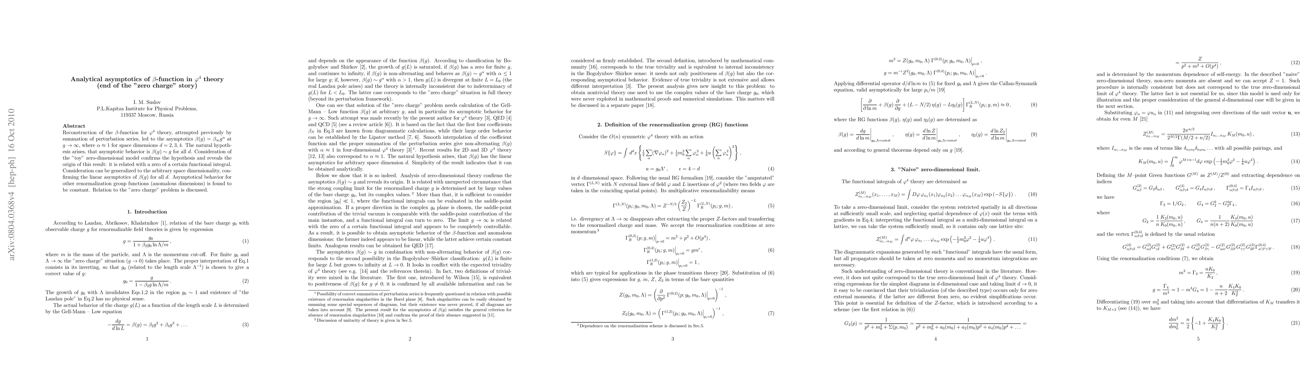 Reconstruction of the \beta-function for \phi^4 theory, attempted previously by summation of perturbation series, leads to asymptotics \beta(g)=\beta_\infty g^\alpha at g\to\infty, where \alpha\approx 1 for space dimensions d=2,3,4. The natural hypothesis arises, that asymptotic behavior is \beta(g) \sim g for all d. Consideration of the zero-dimensional case confirms the hypothesis and reveals the origin of this result: it is related with a zero of a certain functional integral. Consideration can be generalized to the arbitrary space dimensionality, confirming the linear asymptotics of \beta(g) for all d. Asymptotical behavior for other renormalization group functions (anomalous dimensions) is found to be constant. Relation to the "zero charge" problem is discussed.