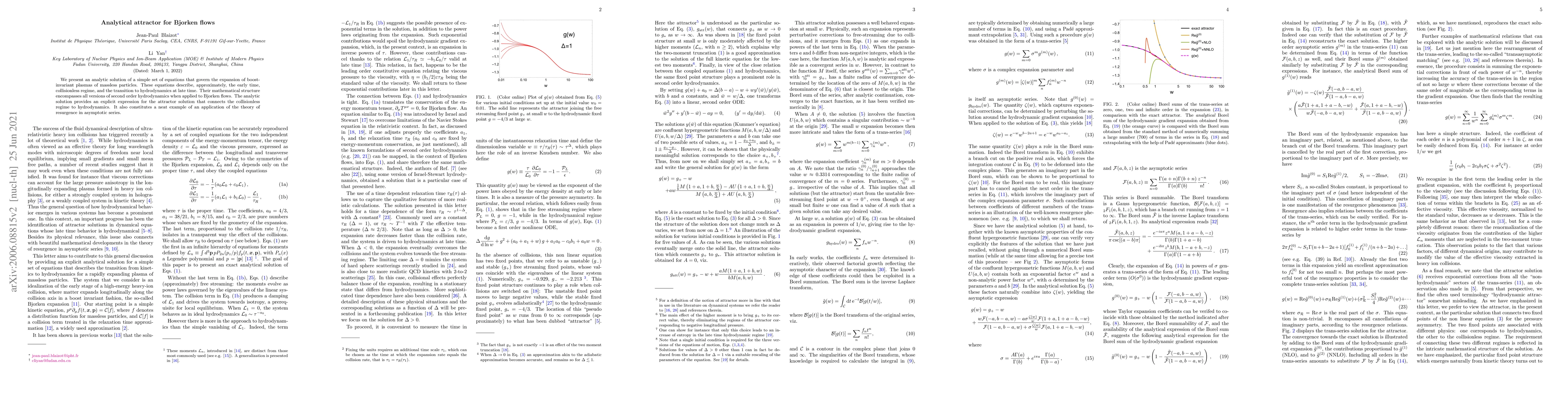We present an analytic solution of a simple set of equations that govern the expansion of boost-invariant plasmas of massless particles. These equations describe, approximately, the early time, collisionless regime, and the transition to hydrodynamics at late time. Their mathematical structure encompasses all versions of second order hydrodynamics when applied to Bjorken flows. The analytic solution provides an explicit expression for the attractor solution that connects the collisionless regime to hydrodynamics. It also constitutes a neat example of an application of the theory of resurgence in asymptotic series.