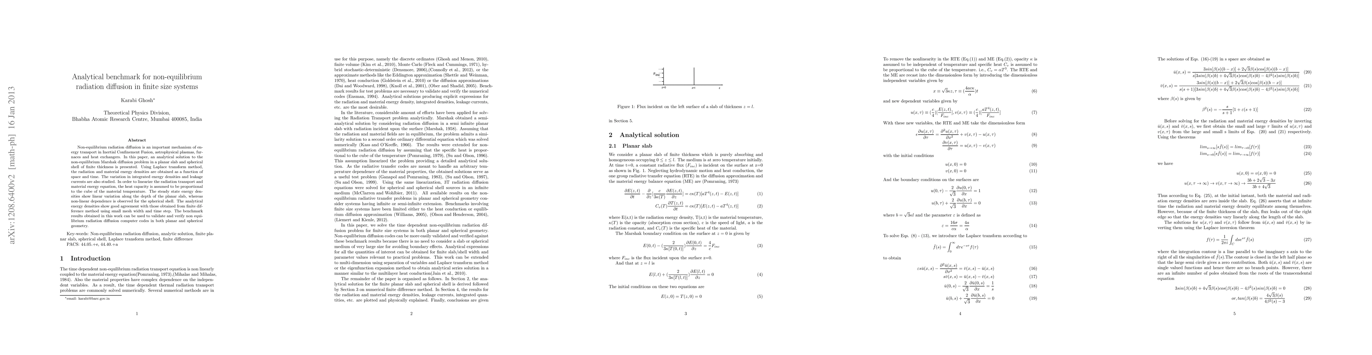 This paper presents an analytical solution for non-equilibrium radiation diffusion in finite size systems, using the Marshak diffusion problem in planar slabs and spherical shells. The study employs Laplace transforms to derive radiation and material energy densities, showing linear and non-linear variations respectively, and provides a benchmark for validating non-equilibrium diffusion computer codes.